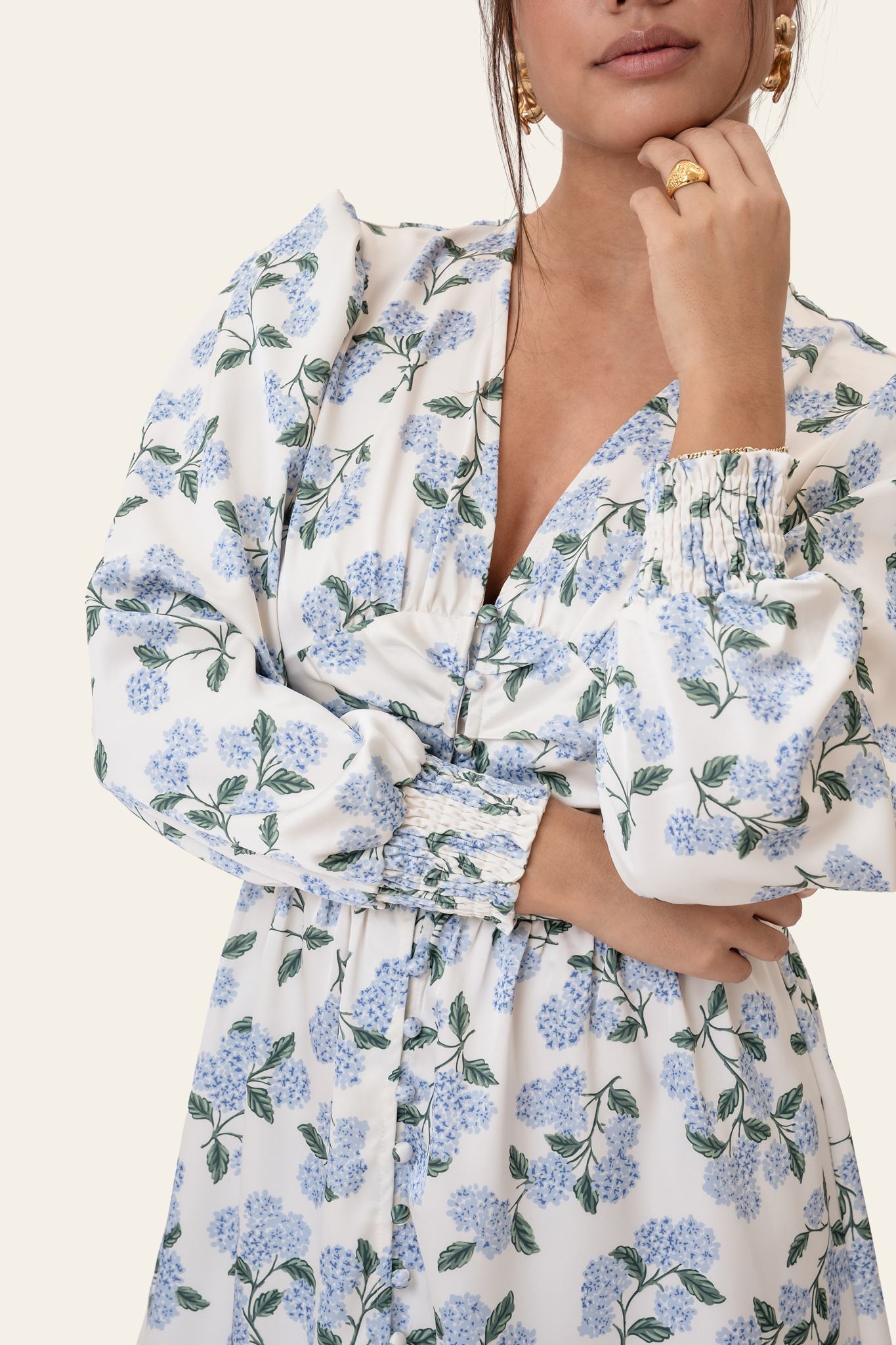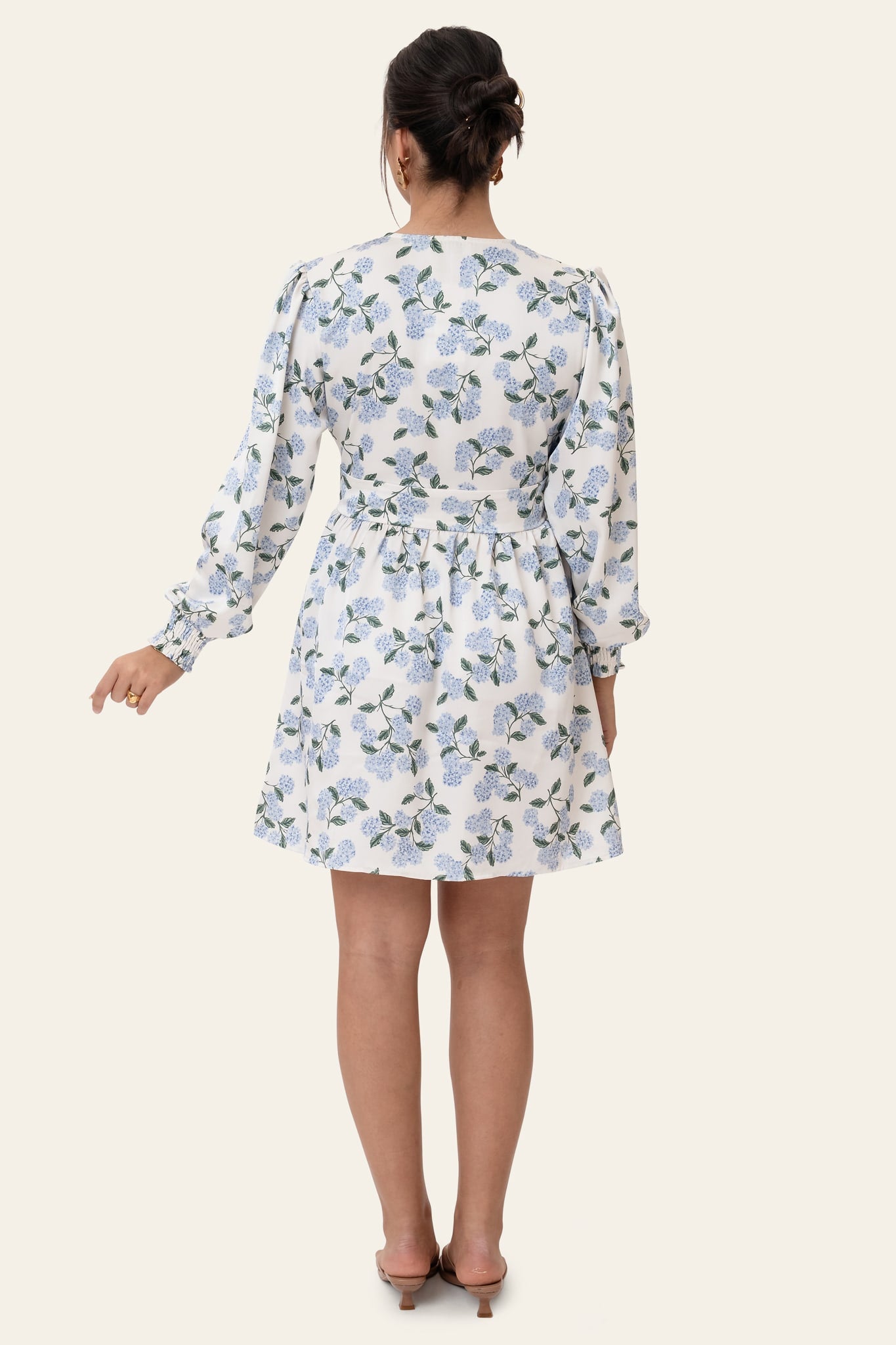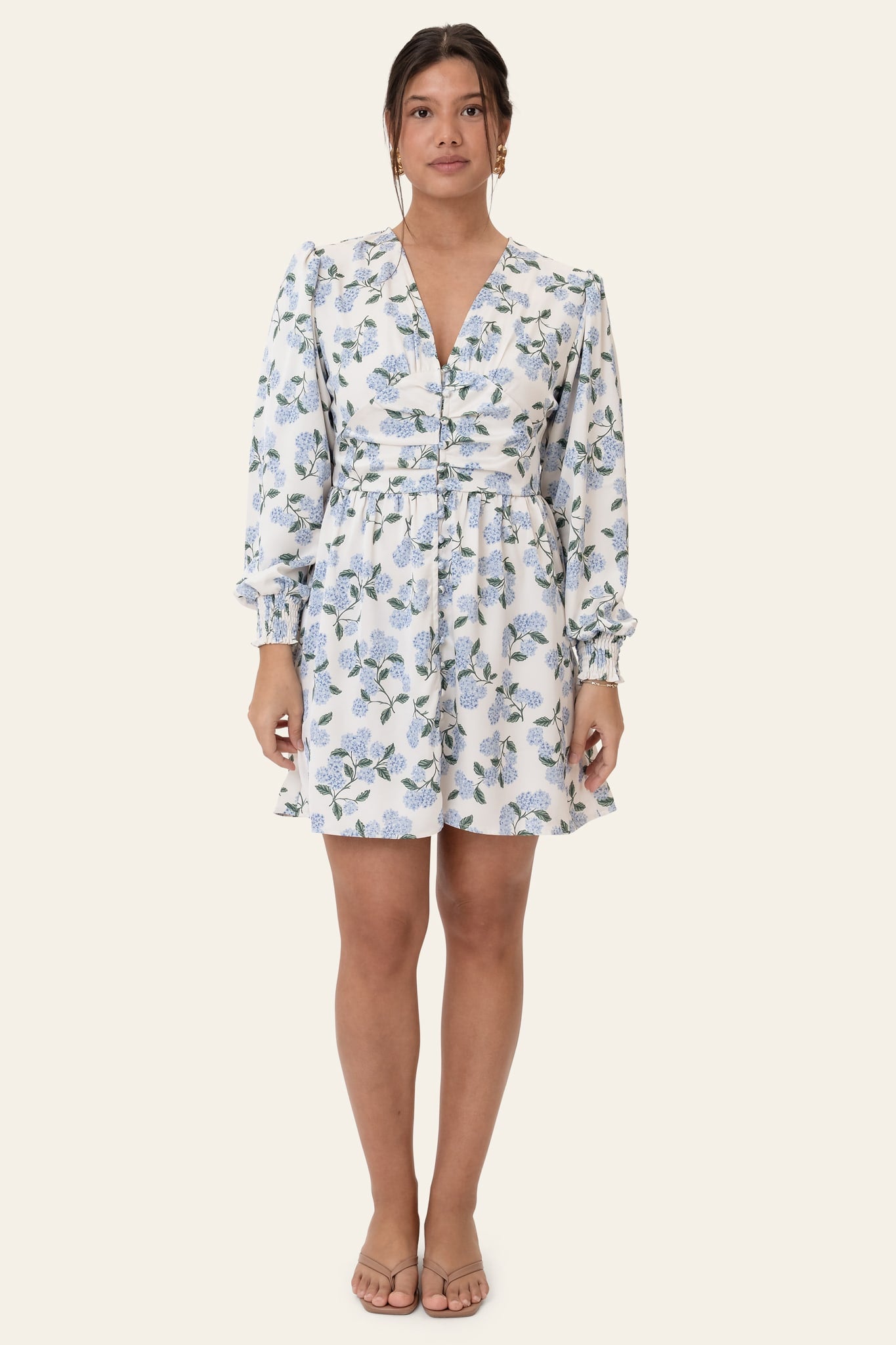 Vakker kort kjole i blått hortensiatrykk med lange ermer. Kjolen har V-hals og knapper hele veien ned foran for lukking. Den har en tettsittende silhuett rundt bysten og midjen, med en løsere passform nederst. Ermene har strikk i mansjettene, slik at de kan trekkes opp for et kortere utseende.