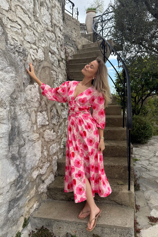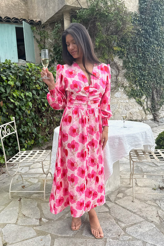 Vakker lang kjole i rosa blomstertrykk med lange ermer. Kjolen har V-hals og knapper hele veien ned foran for lukking. Den har en tettsittende silhuett rundt bysten og midjen, med en løsere passform nederst. Ermene har strikk i mansjettene, slik at de kan trekkes opp for et kortere utseende.