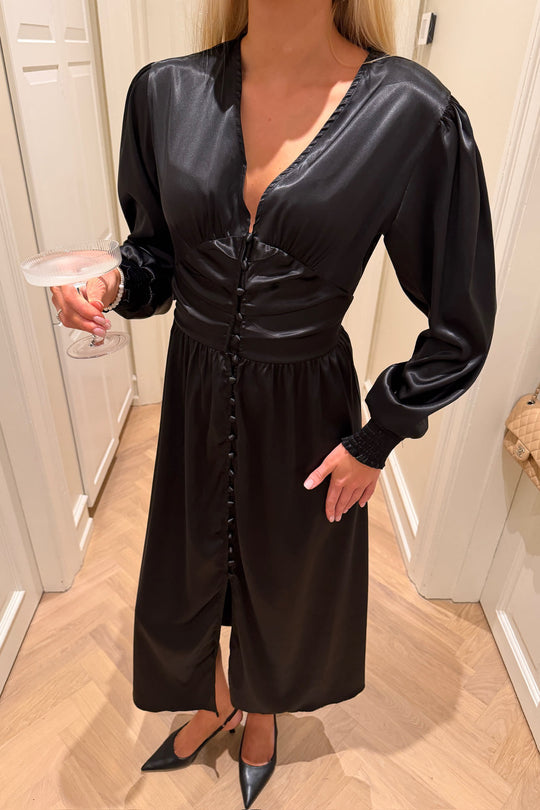 En elegant midikjole i blank, svart sateng, designet med vakre feminine detaljer. Kjolen har en flatterende passform med en definert midje og myk drapering foran, som fremhever figuren på en sofistikert måte. Den dype V-halsen og de lange ermene med vaffelmønster i mansjettene skaper et romantisk og tidløst utseende. Forsiden er utsmykket med små, stoffkledde knapper som går helt ned, og avsluttes i en subtil splitt som gir bevegelse og et elegant preg. Det myke, lett skinnende satengstoffet faller vakkert og gir kjolen en eksklusiv følelse – perfekt for både spesielle anledninger og festlige kvelder. Ermene har strikk i mansjettene, slik at de kan dras opp for et kortere utseende. Style den med hæler og en enkel clutch for et klassisk, sofistikert utseende – eller med støvler for et mer moderne uttrykk.