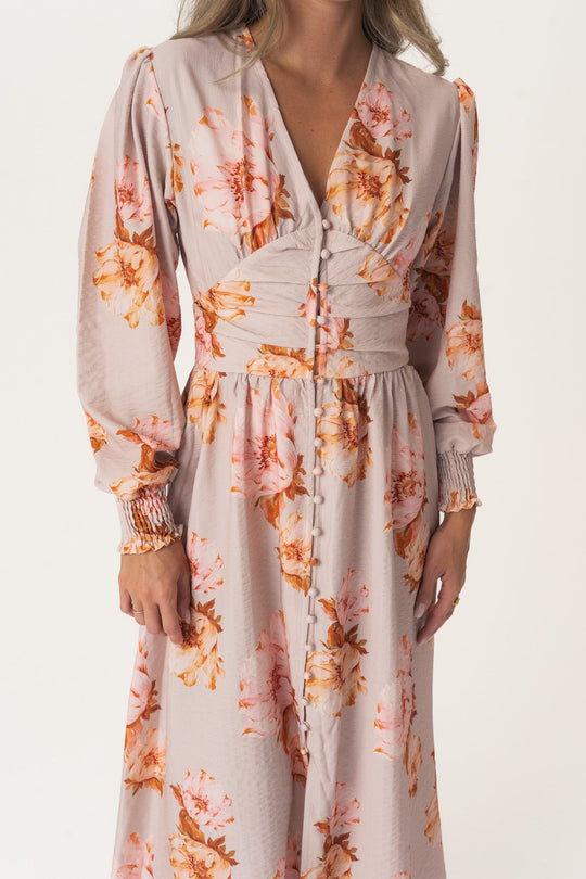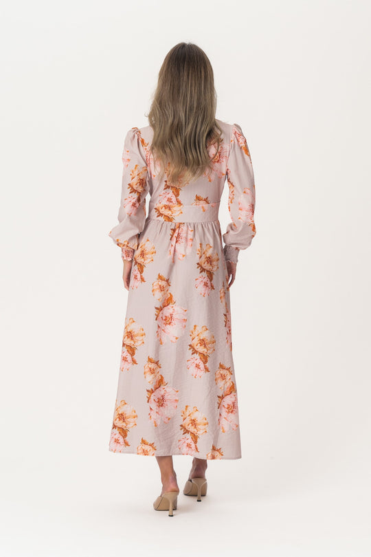 Vakker lang kjole med blomstertrykk og lange ermer. Kjolen har V-hals og knapper hele veien ned foran for lukking. Den har en tettsittende silhuett rundt bysten og midjen, med en løsere passform nederst. Ermene har strikk i mansjettene, slik at de kan trekkes opp for et kortere utseende.