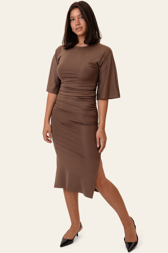 Elegant lang kjole i mørkebrun med en tettsittende silhuett. Kjolen har korte ermer og rund halsutringning. Kjolen har rysjer på sidene og en splitt i hver side nederst. Kjolen er laget av et elastisk materiale.
