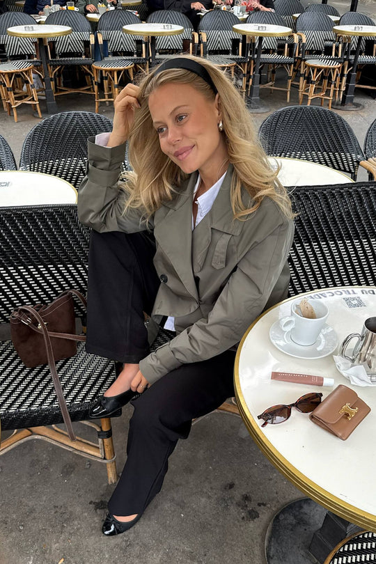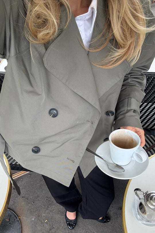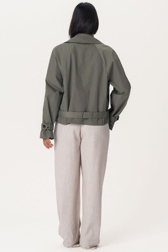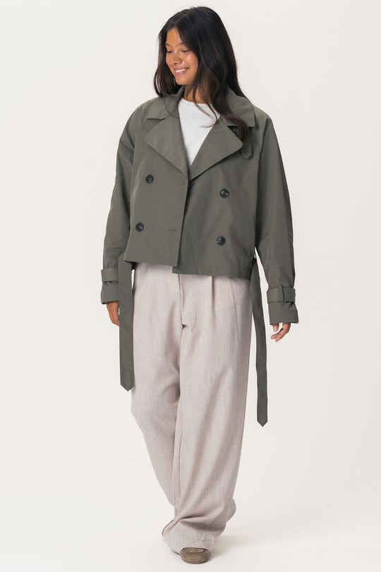 Kort trenchcoat i grønt med løs passform. Trenchcoaten har naturfargede knapper foran for lukking og stroppdetaljer på ermene, som også festes med en knapp. Trenchcoaten har knyting rundt midjen og lommer.