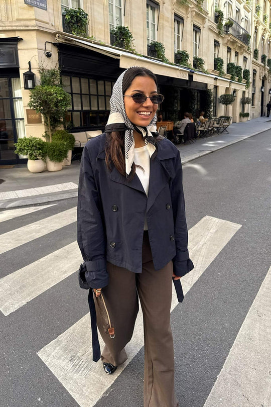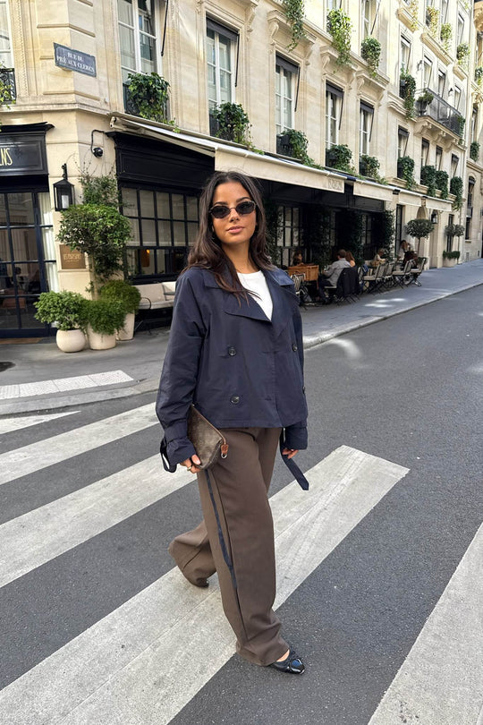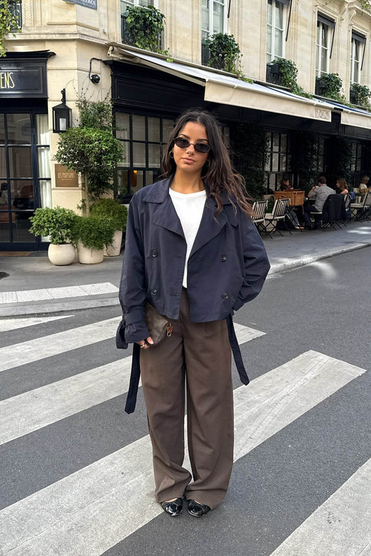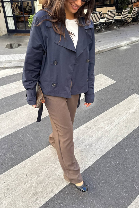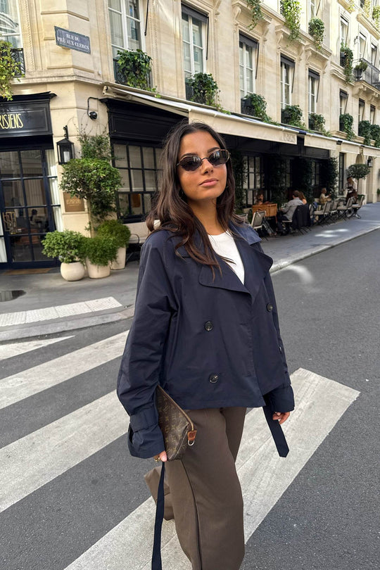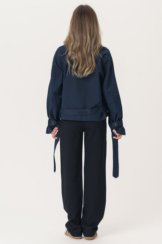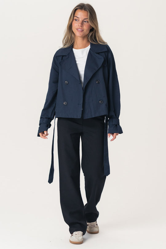 Kort trenchcoat i marineblå med løs passform. Trenchcoaten har naturfargede knapper foran for lukking og stroppdetaljer på ermene, som også festes med en knapp. Trenchcoaten har knyting rundt midjen og lommer.