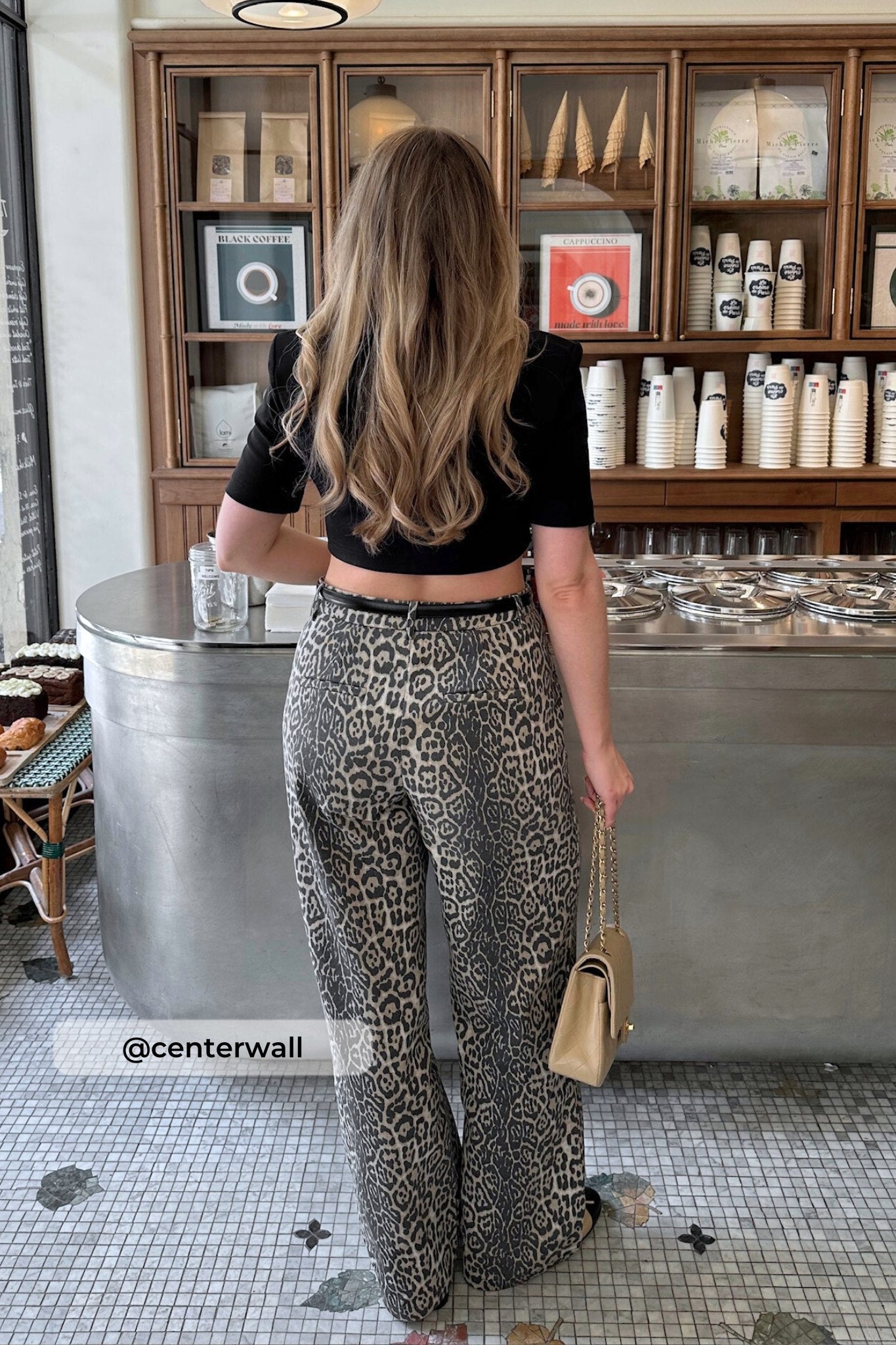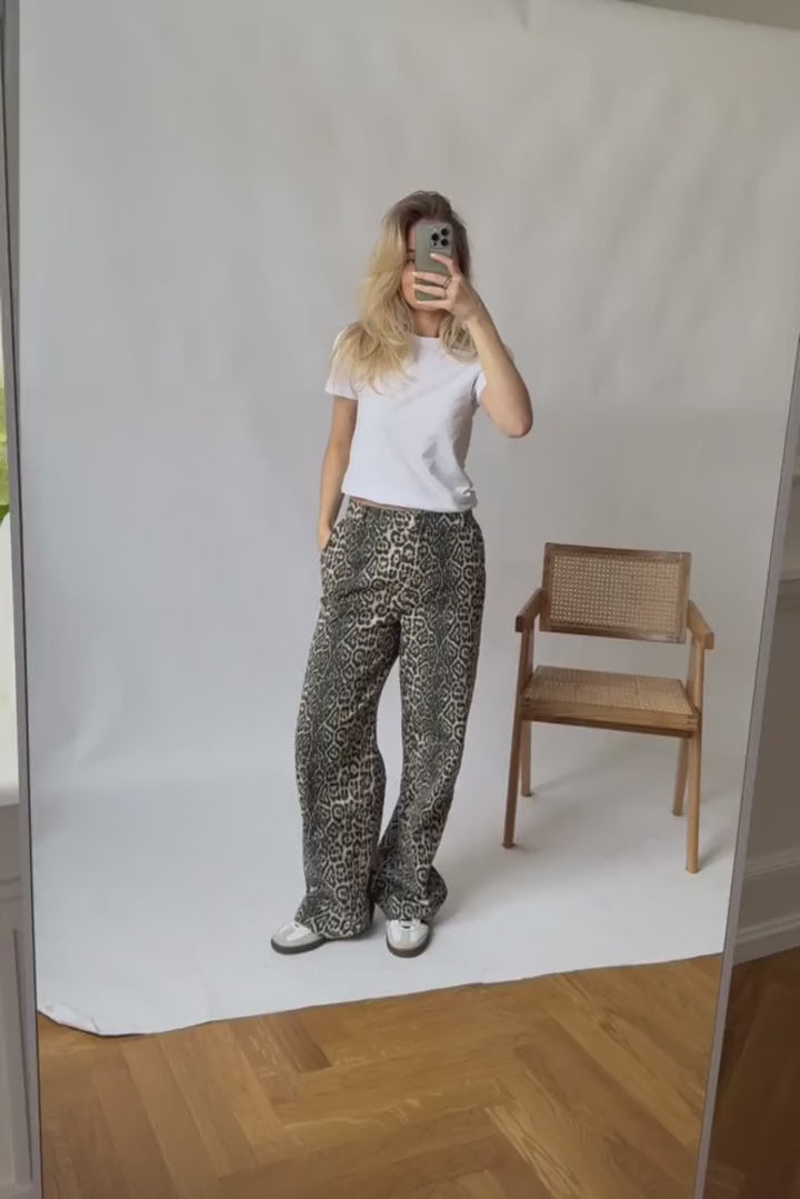 Leo-printede bukser med brede ben, beltestropper og lommer.