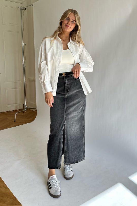 Washed black, denim skirt with pockets, a zipper as closure and a slit on the front.