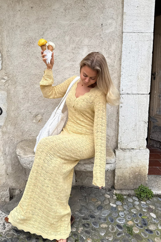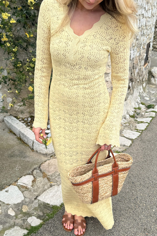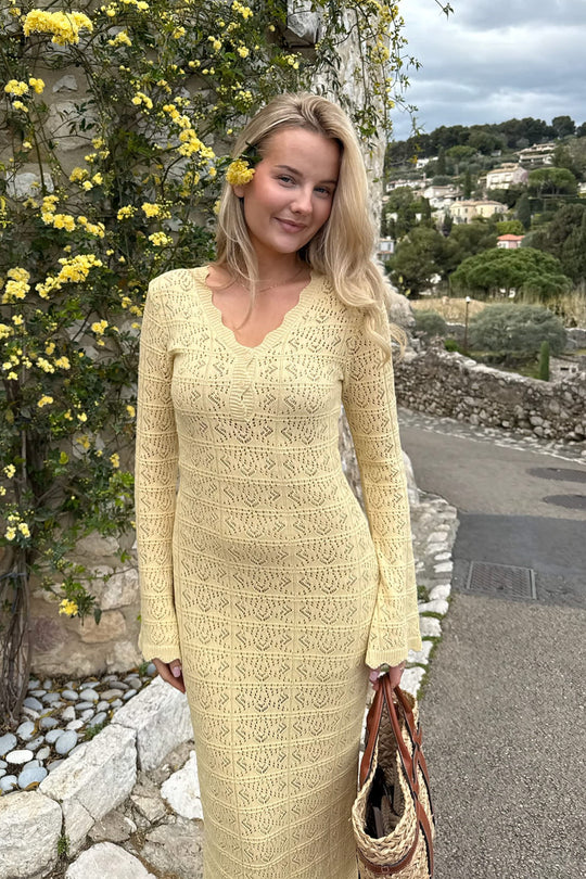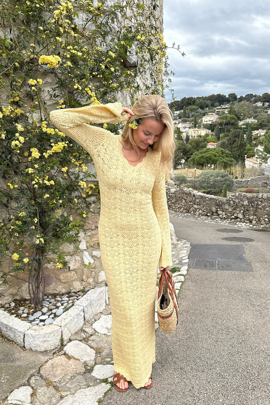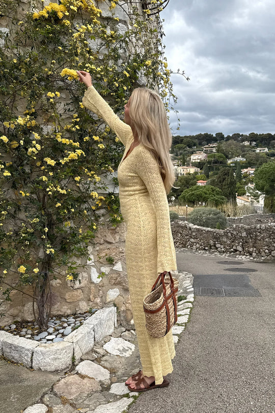 Vakker gul maxi-kjole med broderte detaljer og lange ermer, V-hals og knapper som lukking foran.