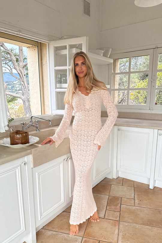 Vakker lyserosa maxi-kjole med broderte detaljer og lange ermer, V-hals og knapper som lukking foran.