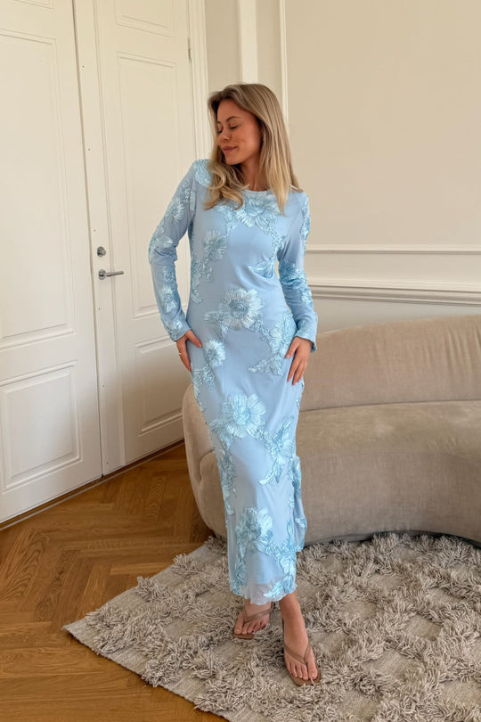 Vakker nettingkjole i blått med blå 3D blomsterdetaljer. Kjolen har lange ermer og rund hals. Den har slisser på begge sider, noe som gir et elegant preg til designet.