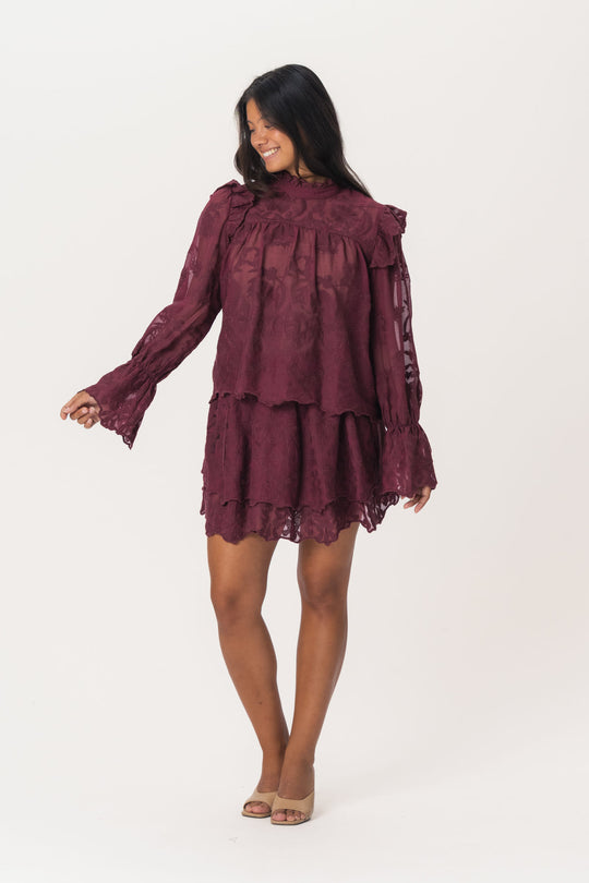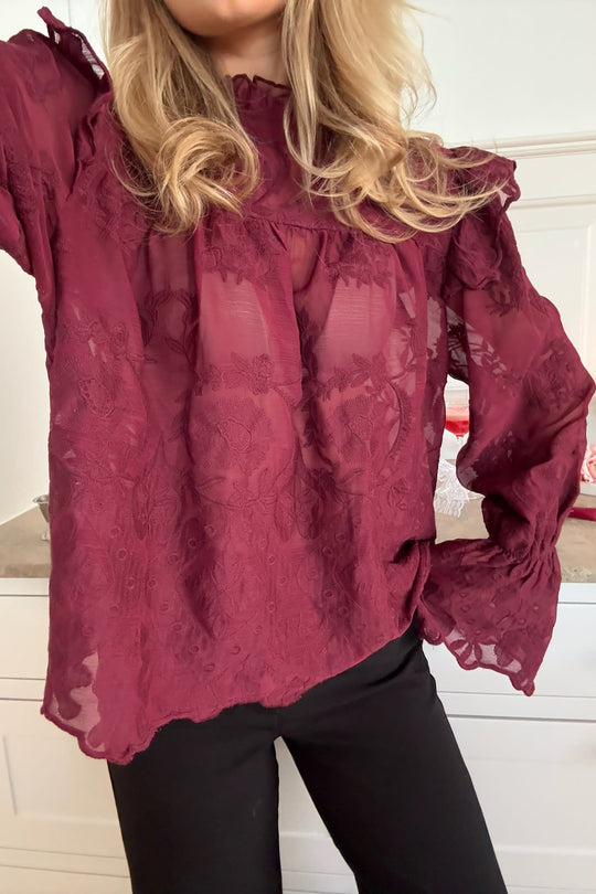 Gjennomsiktig blondeskjorte i en unik vintagelook med frilldetaljer, lange ermer og høy hals. Bruk den med en egen topp under.