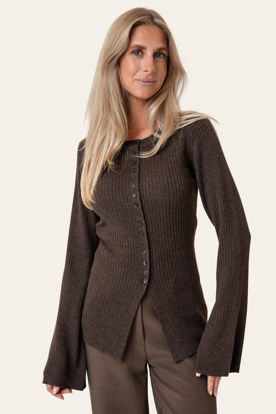 En vakker ribbestrikket cardigan i en mørk brun nyanse, designet med et tidløst og feminint uttrykk. Cardiganen har en slank, tettsittende passform og er laget av et mykt, elastisk materiale som sikrer både komfort og bevegelsesfrihet. Forsiden er utsmykket med små, skinnende knapper som går helt ned, og en diskret splitt nederst gir et elegant og moderne preg. De lett utsvingte ermene skaper et mykt fall og et feminint utseende. Perfekt til både hverdagsbruk og mer elegante anledninger – style den med skreddersydde bukser eller et skjørt for et klassisk, sofistikert antrekk.