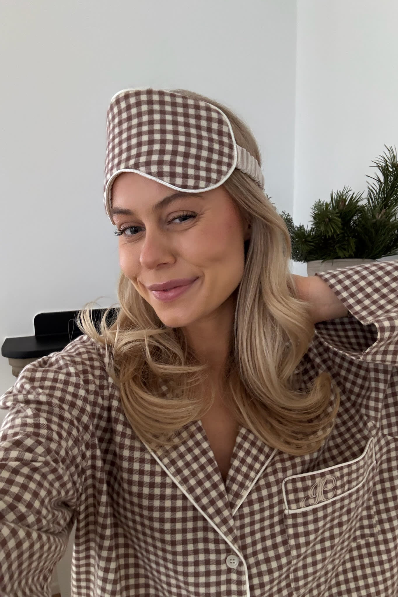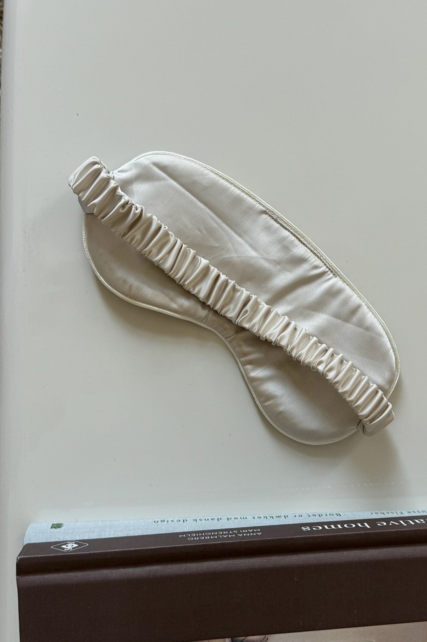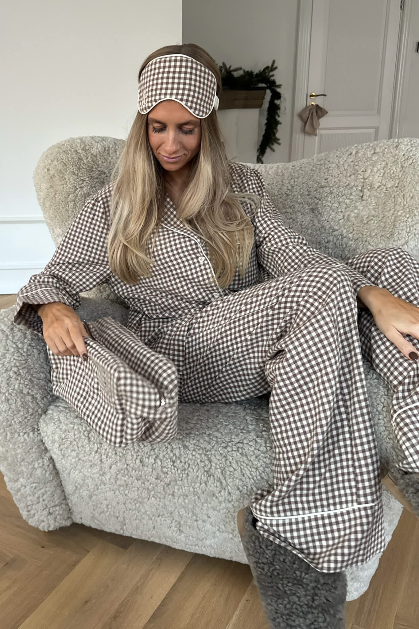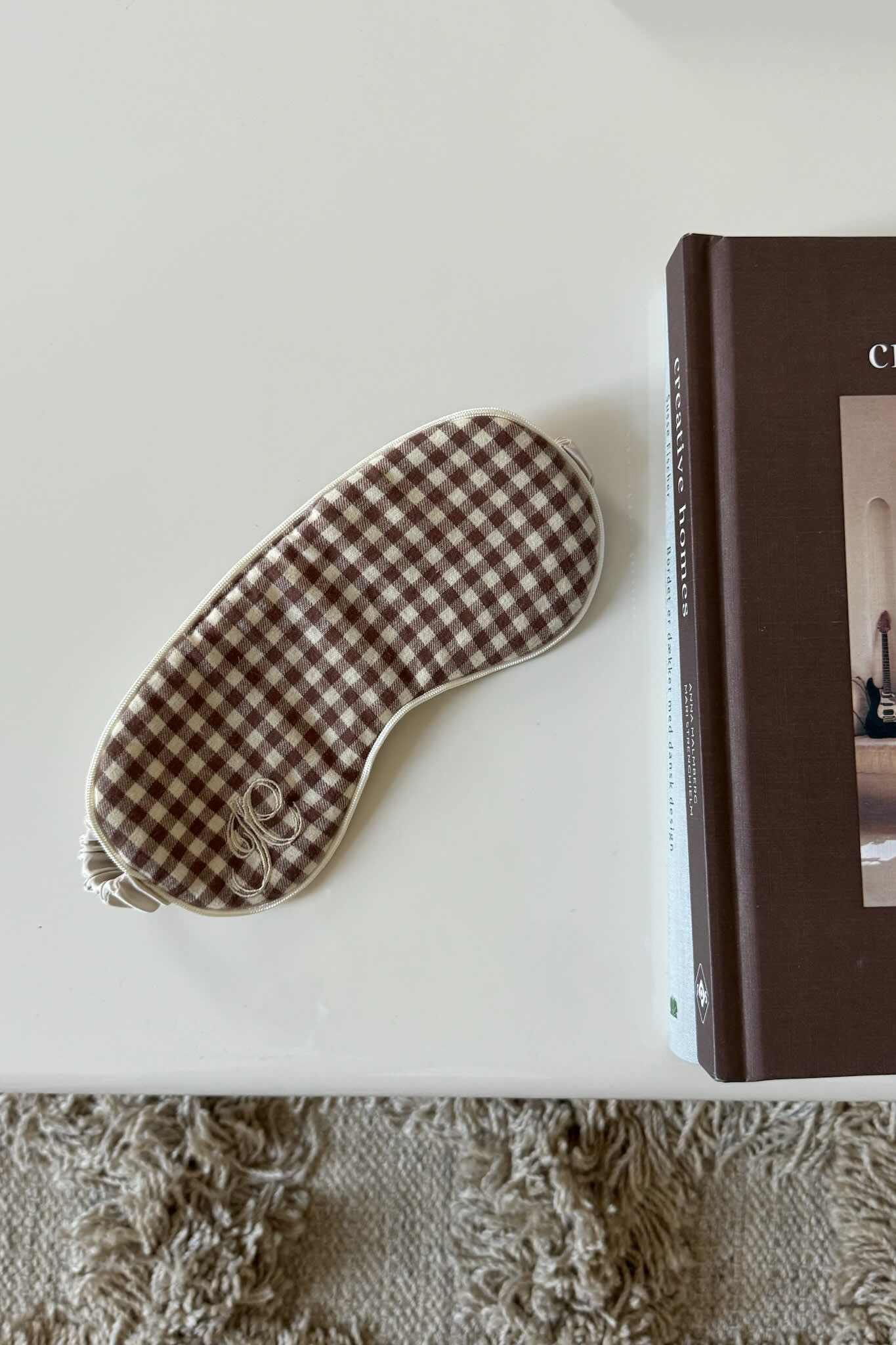 Myk sovemaske med beige ruter.