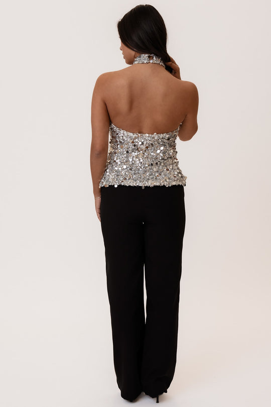 En iøynefallende halterneck-topp dekket av skimrende sølvpaljetter som reflekterer lyset vakkert og skaper et luksuriøst festantrekk. Toppen har en elegant høy halsutringning og en flatterende, tettsittende silhuett som fremhever figuren. Den åpne ryggen gir et sofistikert og sensuelt preg, noe som gjør den ideell for spesielle anledninger. Den er fôret for ekstra komfort og har en lett stretch for å sikre en perfekt passform. Lukningen med to knapper i halsen gir en ren og stilig finish. Style den med det matchende paljetskjørtet for et komplett, glamorøst sett – eller kombiner den med svarte bukser og hæler for et elegant og moderne kveldsantrekk.