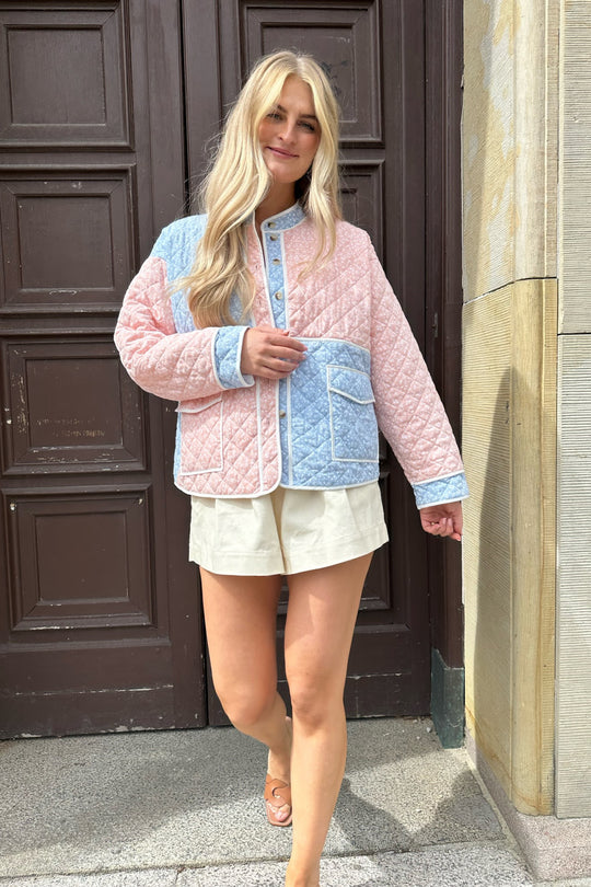 Light blue and pink quilted jacket in an oversized fit with small white flower print, two big pockets and buttons down the front.
