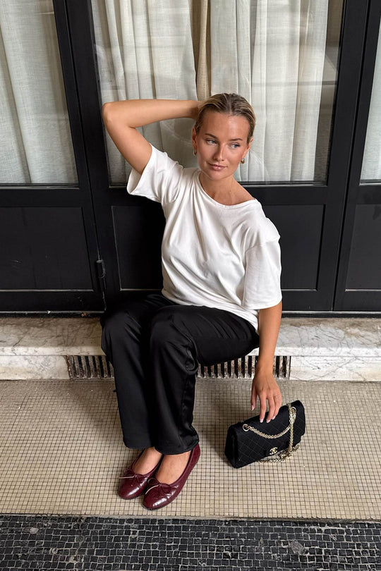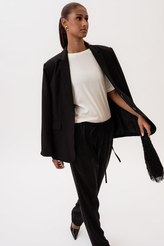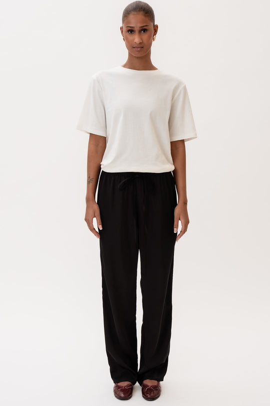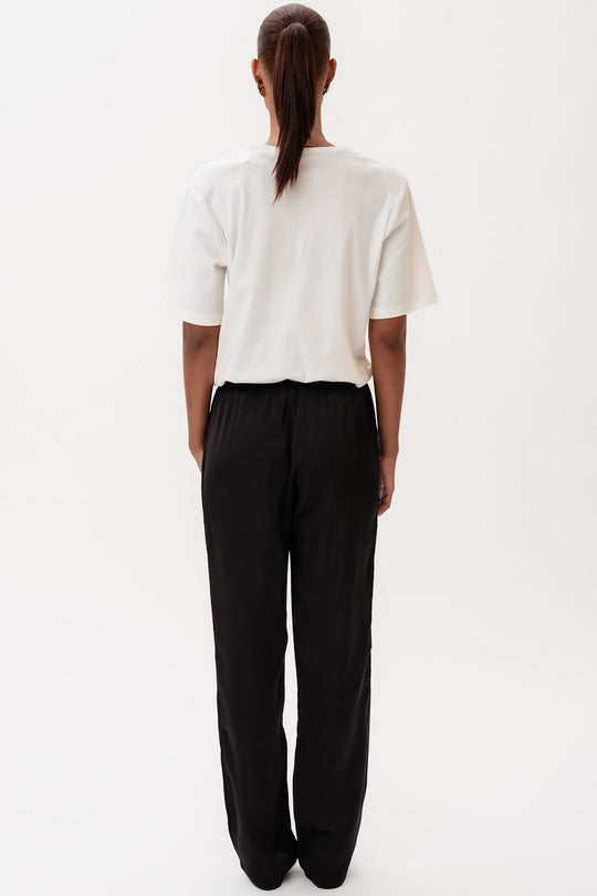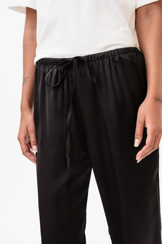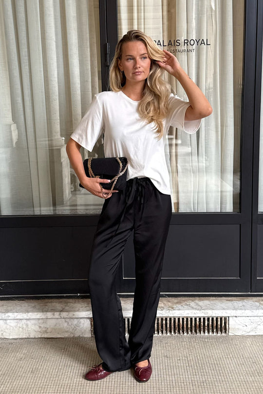 Svarte bukser laget av luksuriøs og elegant sateng. De har en løs passform og et knytebelte i midjen for justerbar komfort og stil.