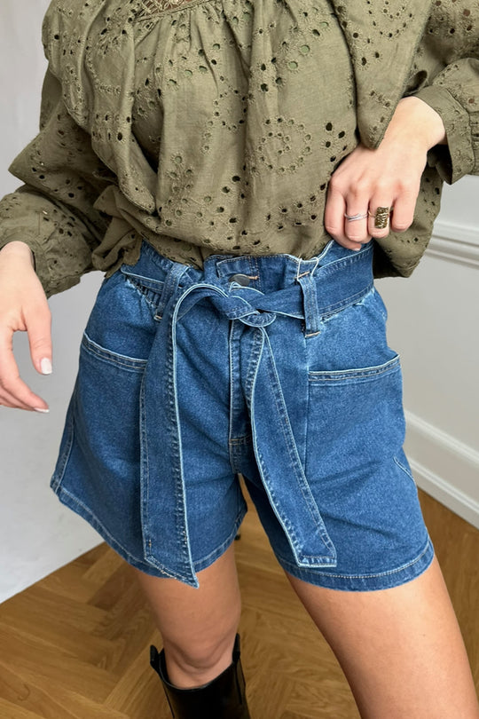 Highwaisted shorts with ruffle details and a tie around the waist. Closes with a zipper and a button.