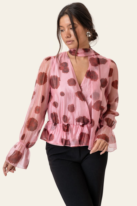 En fantastisk bluse i rosa med rødt blomstertrykk. Blusen har en avslappet passform med en definert midje, lange ermer og en dyp V-hals med omslagsdetalj og delikate rysjer. De lange ermene er avsluttet med elastiske mansjetter, noe som skaper en subtil rysje og gir ermene en mykt puffet silhuett. Blusen har et knytebelte som kan bæres i midjen eller styles som et halstilbehør for et ekstra preg.