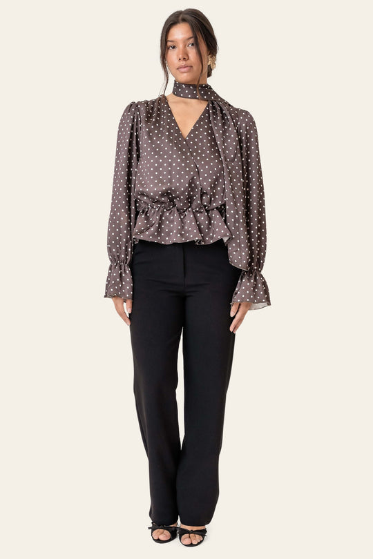 En fantastisk bluse i mørkebrun med hvite prikker. Blusen har en avslappet passform med en definert midje, lange ermer og en dyp V-hals med omslagsdetalj og delikate rysjer. De lange ermene er avsluttet med elastiske mansjetter, noe som skaper en subtil rysje og gir ermene en mykt puffet silhuett. Blusen har et knytebelte som kan bæres i midjen eller styles som et halstilbehør for et ekstra preg.