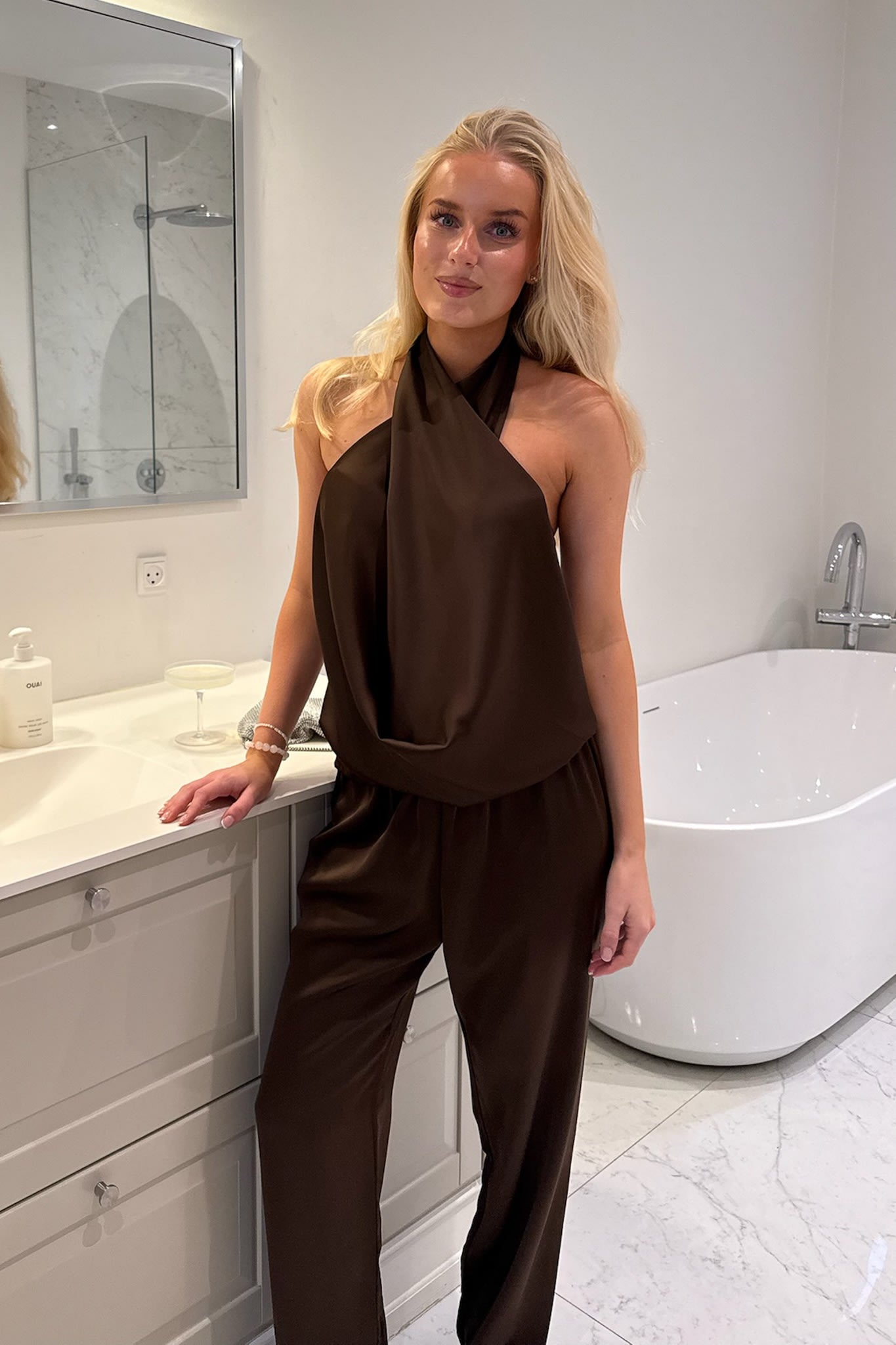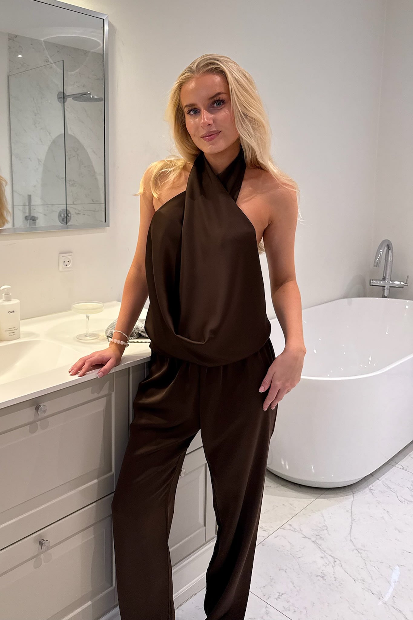 En elegant halterneck-topp laget av skinnende sateng med vakkert drapert front. Det brede knytebåndet i halsen skaper et sofistikert utseende, og en åpen rygg gir et feminint og raffinert preg. Det myke satengstoffet har en lett stretch for en flatterende passform og en luksuriøs følelse mot huden. Perfekt for både spesielle anledninger og et elegant hverdagsantrekk – style den med skreddersydde bukser eller et skjørt for et moderne og tidløst antrekk.