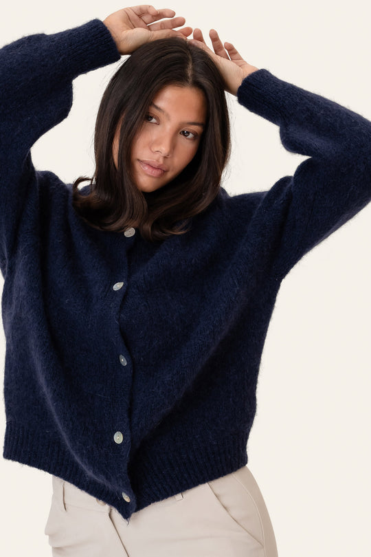 En vakker, lodden mohair-cardigan i marineblått. Cardiganen har lange ermer med brede, tettsittende ribbekanter som gir ermene et mykt puffet utseende. En matchende bred ribbekant finnes også nederst og rundt den runde halsen, noe som skaper en voluminøs silhuett når cardiganen er kneppet opp. Den lukkes foran med elegante, perlelignende knapper for et raffinert preg.