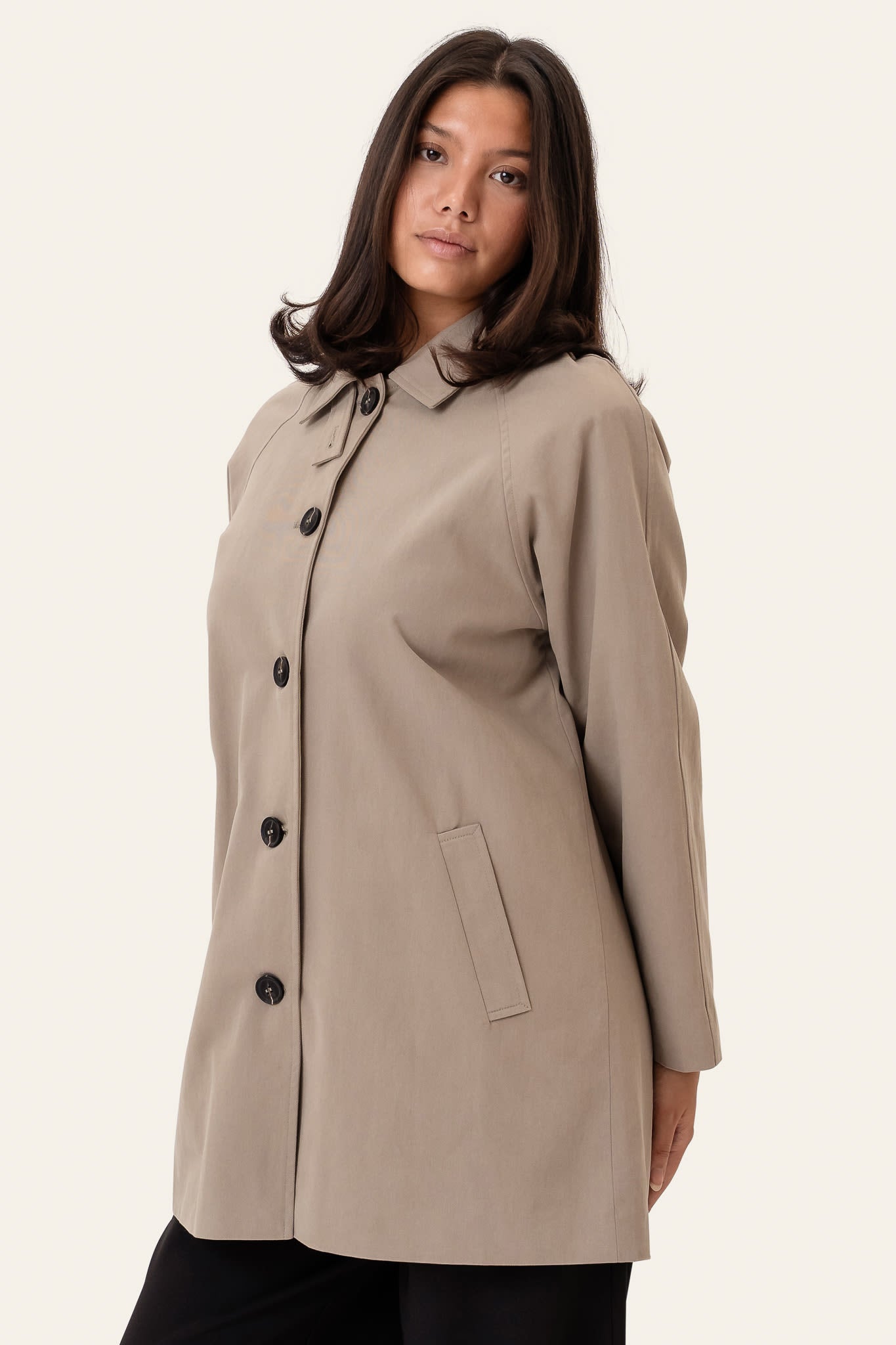 Trenchcoat i et glatt, lett strukturert stoff med en ren og jevn overflate. Designet med klassisk krage og heldekkende knappelukking foran med synlige knapper. Kåpen har lange raglanermer og skråstilte sidelommer foran. Den rette passformen faller rent fra skuldrene for et tidløst og minimalistisk utseende. En subtil splitt bak gir god bevegelsesfrihet og fullfører det enkle designet.