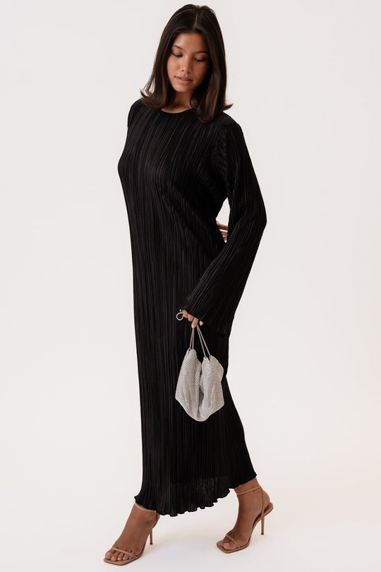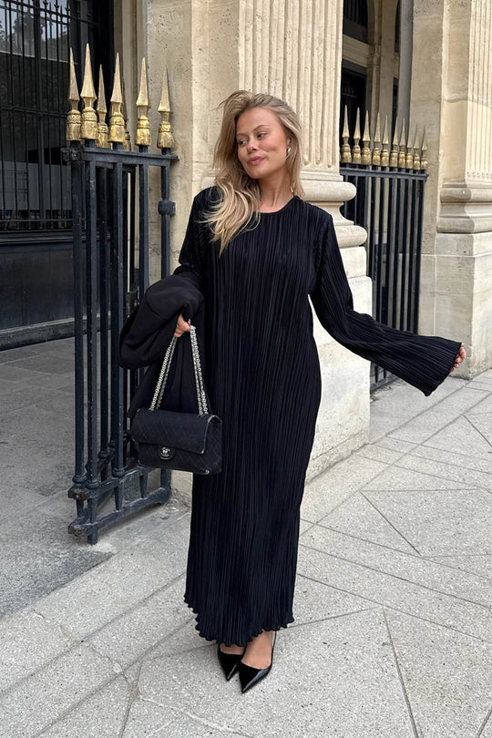 En elegant svart maxikjole laget av et vakkert plissert stoff som beveger seg grasiøst og utstråler sofistikasjon. Kjolen har en rett, avslappet silhuett som faller uanstrengt langs kroppen for et moderne og raffinert antrekk. Diskré skulderputer gir designet en subtil struktur og en forhøyet og selvsikker form. De lange ermene avsluttes i mykt utsvingte, bølgete kanter som fremhever kjolens feminine flyt. De lett skimrende foldene fanger lyset vakkert, noe som gjør denne kjolen perfekt for både spesielle anledninger og elegant hverdagsbruk. Style den med hæler og en clutch for et tidløst kveldsantrekk, eller med flate sko for et elegant og diskret antrekk.