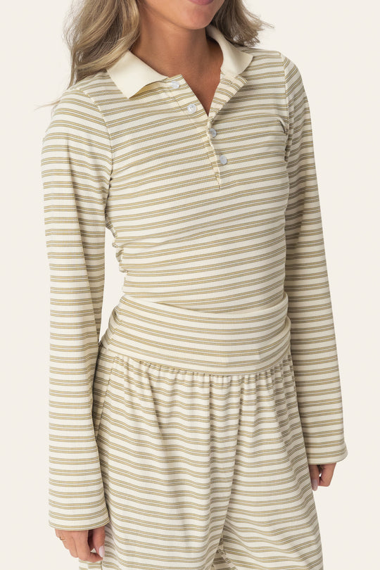 En fin poloskjorte i gule striper. Skjorten har lange rette ermer og en tettsittende passform. Den har en hvit skjortekrage med fire knapper, slik at den kan kneppes helt opp til halsen eller brukes åpen i en V-form halvveis ned på brystet. Poloskjorten er laget av et elastisk materiale.