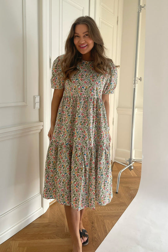VilmaIC Lang Kjole - Grønn Blomstertrykk