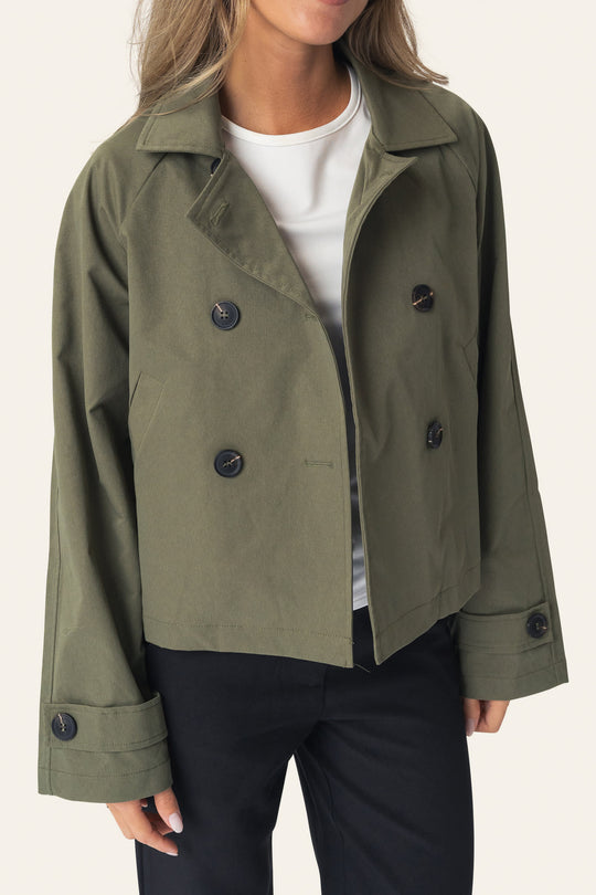 Kort trenchcoat i en tidløs grønnfarge. Jakken har dobbeltspent lukking, brede slag og justerbare ermestropper for en raffinert finish. Den rene silhuetten og det strukturerte stoffet gir den et uanstrengt elegant utseende, perfekt for hverdagsbruk eller overgangssesongene. Den avslappede passformen gjør den enkel å style over skjorter, strikkeplagg eller kjoler.