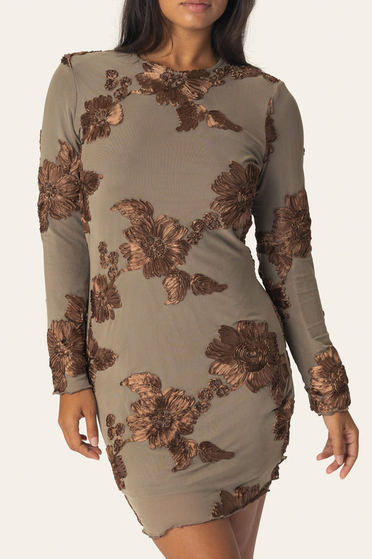 Elegant kort kjole i brunt med en tettsittende silhuett. Kjolen har lange ermer og rund halsutringning. Den er utsmykket med 3D-blomsterdetaljer, noe som gir designet ekstra karakter. Kantene på kjolen er avsluttet med rysjer.