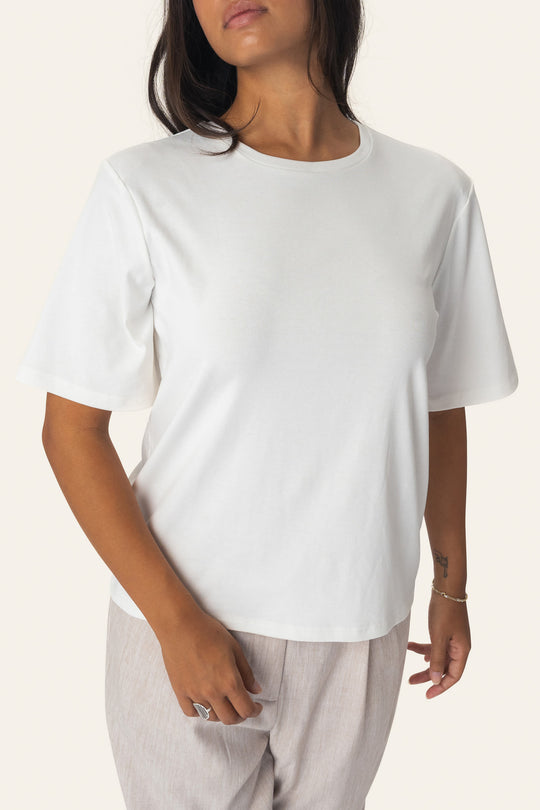 En klassisk hvit T-skjorte laget av myk og komfortabel bomull. Med et rent, tidløst design med rund hals og en avslappet passform, noe som gjør den til et perfekt plagg i garderoben. Laget av et høykvalitets bomullsstoff som beholder formen vask etter vask og føles skånsomt mot huden. Bruk den alene for et minimalistisk utseende, eller lag på lag under strikkegensere og blazere for en enkel styling.