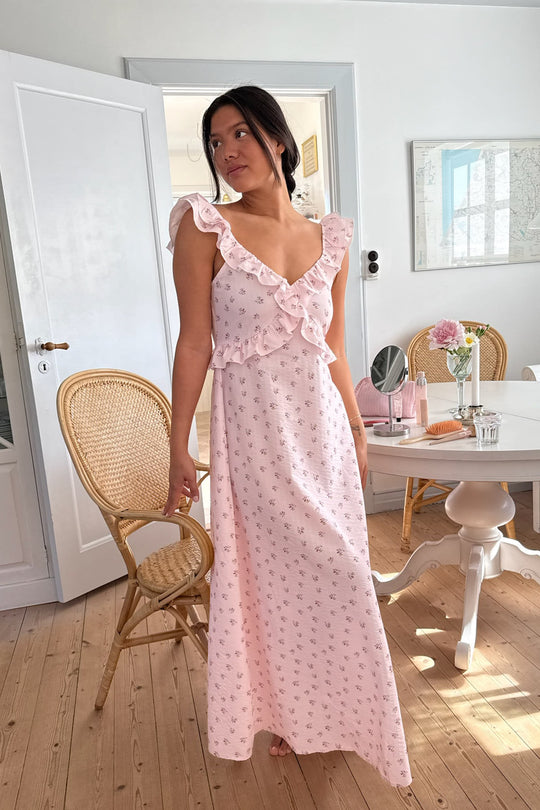 Vakker lang kjole i rosa med små blomster. Kjolen har V-hals og skulderstropper med volangdetaljer som strekker seg over bysten og rundt midjen. Den har en dyp åpen rygg, elegant knyttet med en sløyfe. Kjolen har en figursydd silhuett rundt bysten og et flytende skjørt for en grasiøs look.