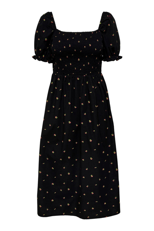 Black dress with smock details around the chest, short puffy sleeves and cute cherry print.