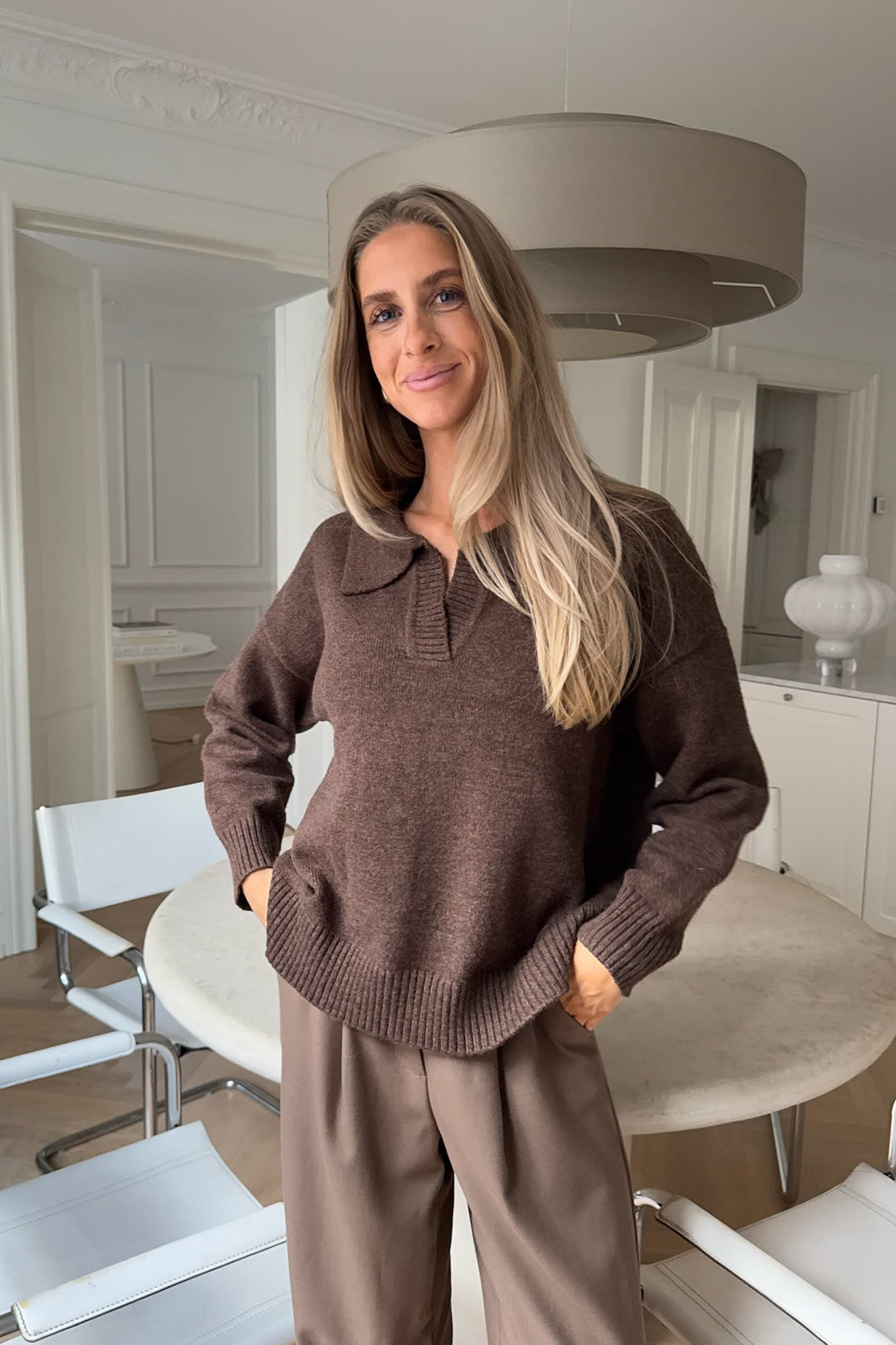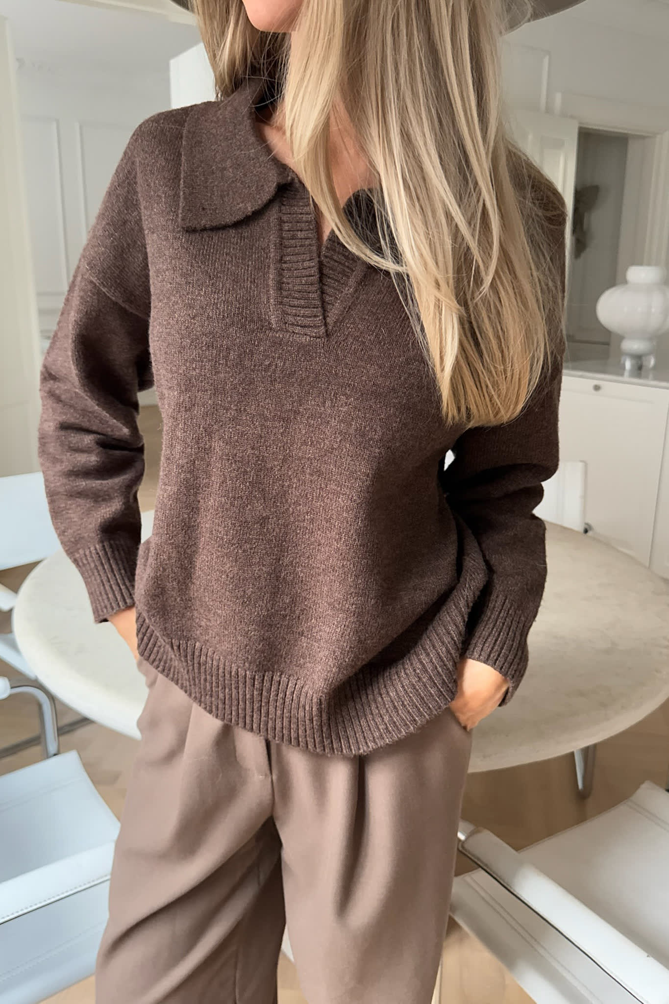 Myk polo i strikket ullblanding. Ribbedetaljer på krage og mansjetter.