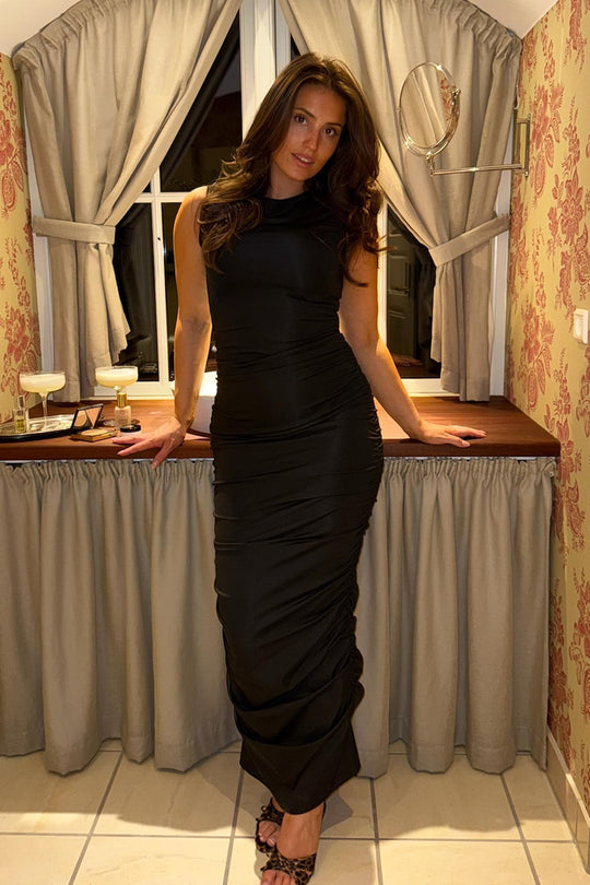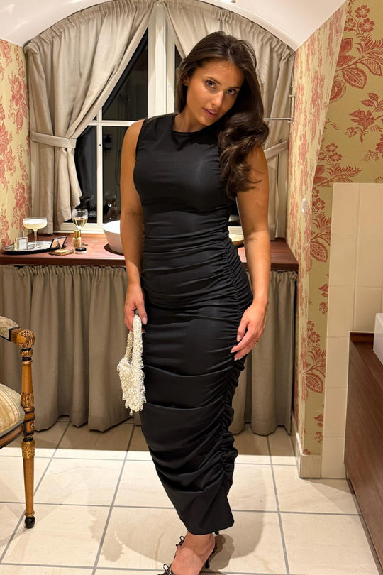 Elegant lang kjole i svart med en tettsittende silhuett. Kjolen har korte ermer, rund halsutringning og er laget av et elastisk materiale. Kantene på kjolen har rysjer, og rynkingen på sidene lar deg justere lengden for et kortere utseende.
