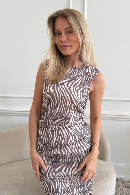 Elegant lang kjole i brunt sebratrykk med en tettsittende silhuett. Kjolen har korte ermer og rund halsutringning. Kantene på kjolen har rysjer, og rynkingen på sidene lar deg justere lengden for et kortere utseende.