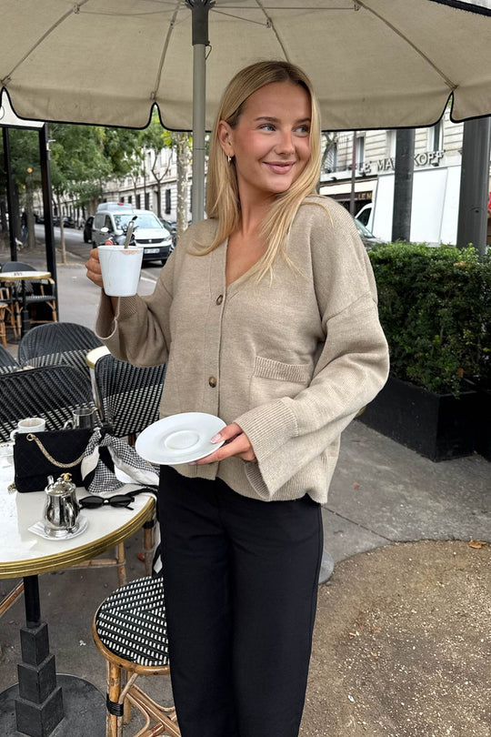 Myk boxy cardigan i ullblanding med ribbedetaljer. Den har to store frontlommer og 3 knapper som lukking.