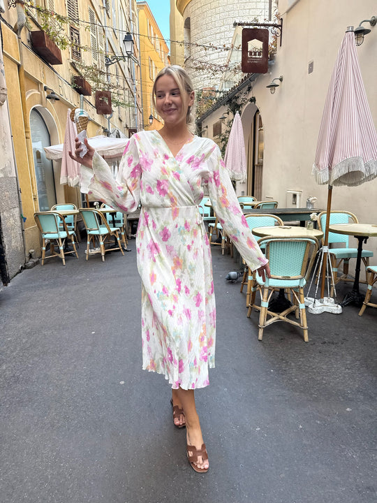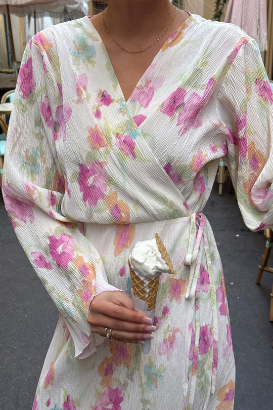 Vakker lang omslagskjole i hvit med rosa blomsterprint. Kjolen har brede lange ermer og knytebånd i midjen. Den har V-utringning og delikate volanger langs kantene.