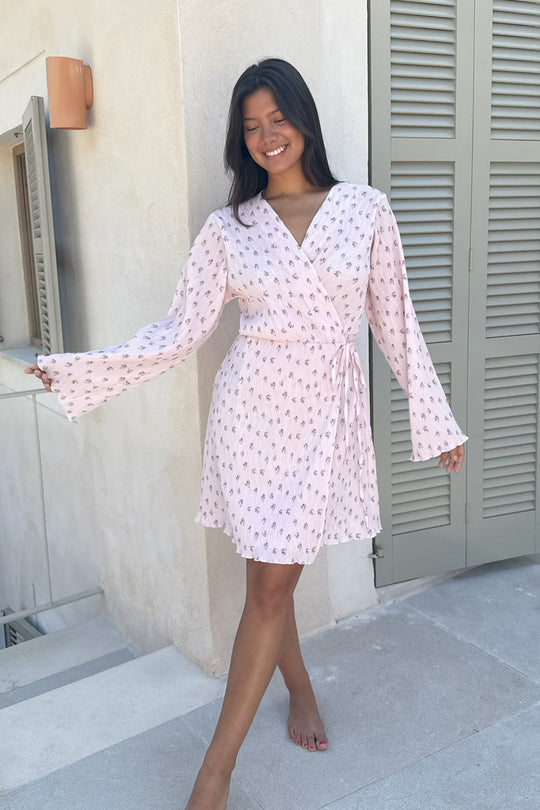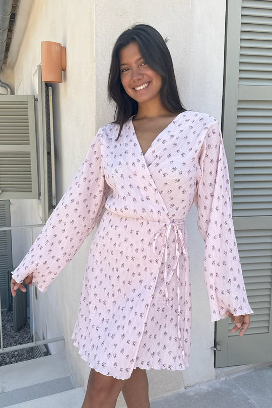 Vakker omslagskjole. Kjolen har vide lange ermer og knytelukking i livet. Den har V-hals og delikate rysjedetaljer langs kantene. Kjolen er laget av et elastisk materiale.