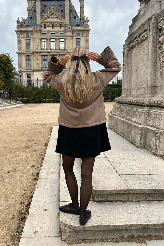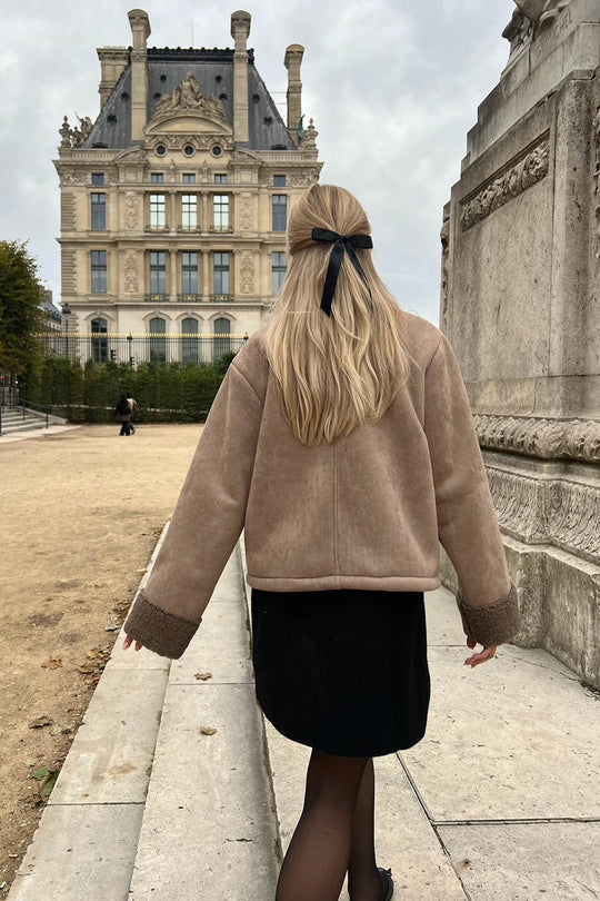 Lysebrun kort teddyjakke i kunstskinn med firkantet passform og lange rette ermer. Foran har den to store lommer, hver lukket med en stor mørk naturfarget knapp. Jakken har en høy halsutringning med en bred, strukturert krage. Både mansjettene og kragen er laget av mykt teddystoff, mens innsiden er fôret med mørkebrun teddy, noe som gjør den herlig varm og behagelig å ha på seg. Den lukkes foran med store mørke naturfargede knapper for et stilig utseende.