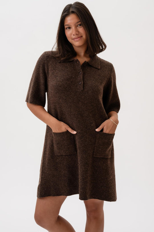 Myk strikket kjole i mørkebrun ullblanding med løs passform. Den har 3 små knapper på kragen, 2 lommer foran og korte ermer.
