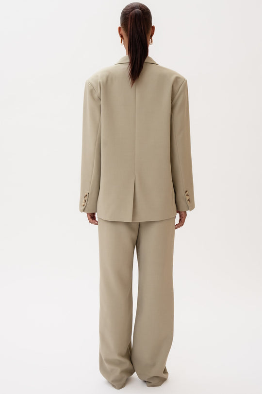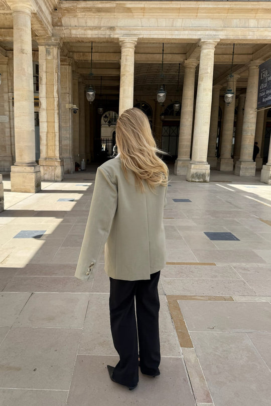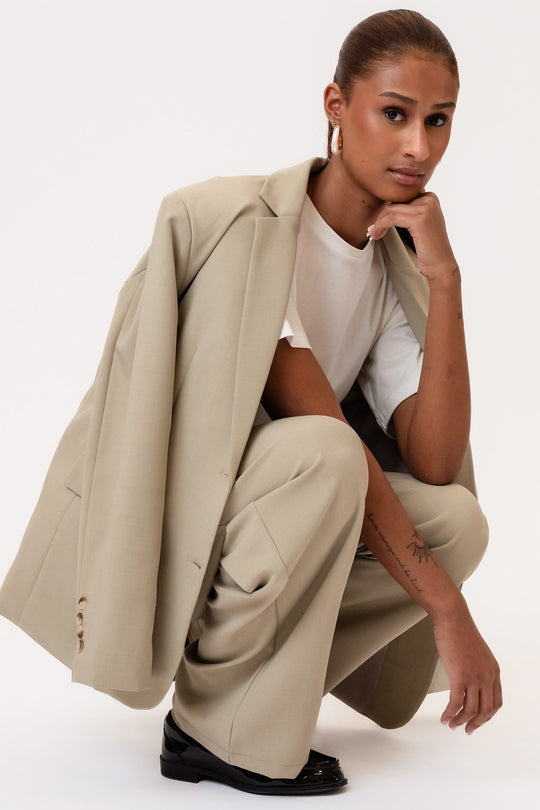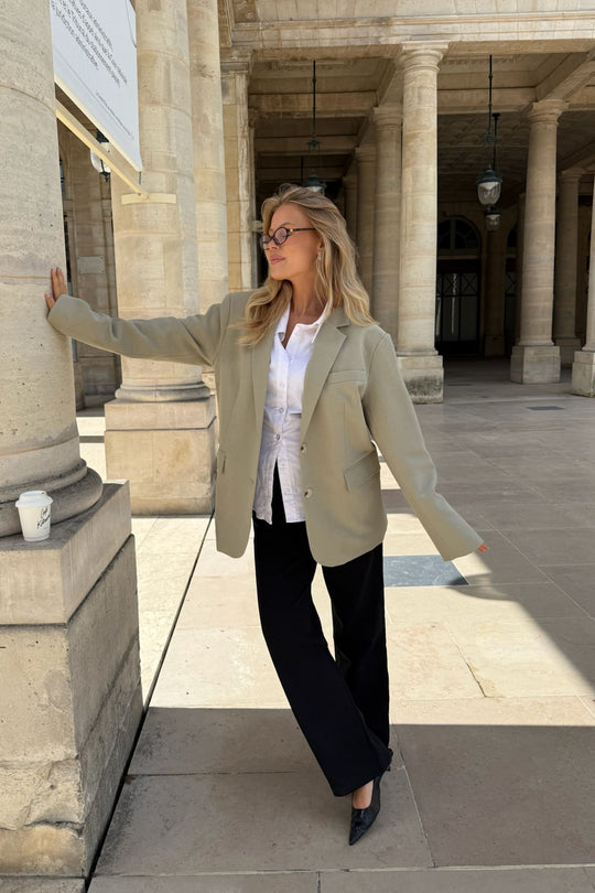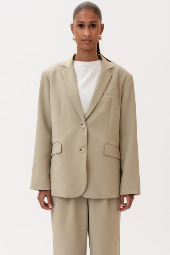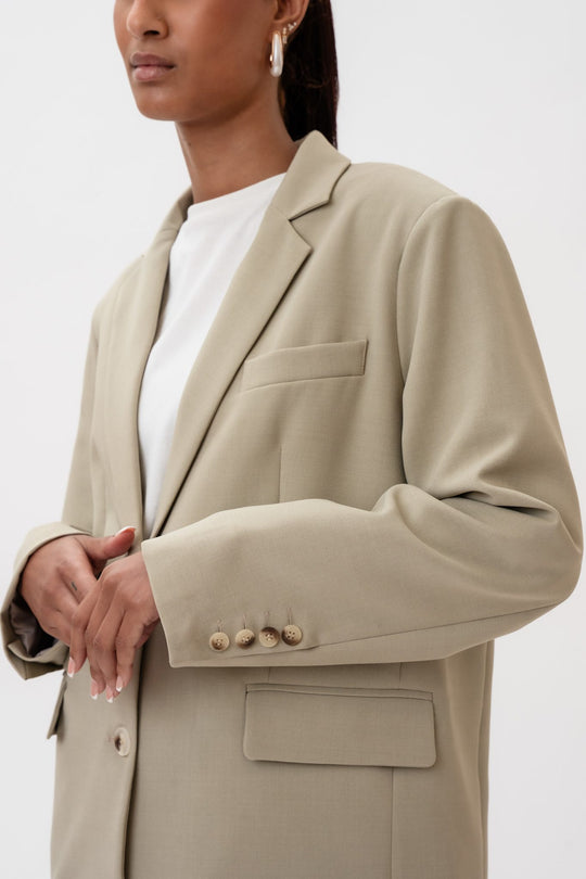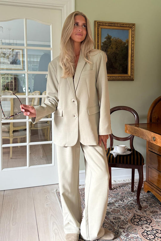 Støvet beige blazer i et vakkert stoff. Den har en rett passform og rette ermer med knappedetaljer i mansjettene. Det er én lomme på venstre bryst, to lommer foran nederst og en skjortekrage som går ned i en V foran, hvor to knapper lukkes. En splitt bak gir et elegant preg til helhetsinntrykket.