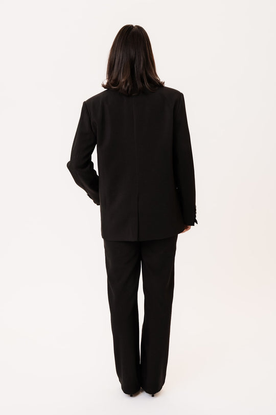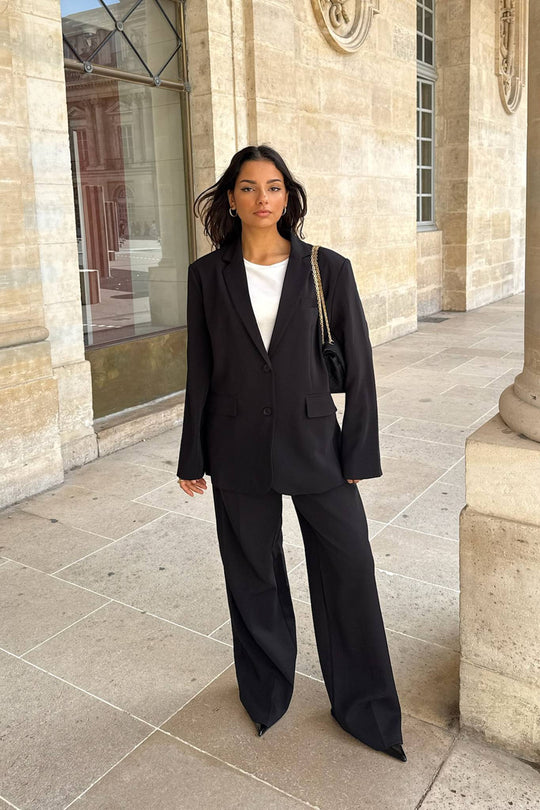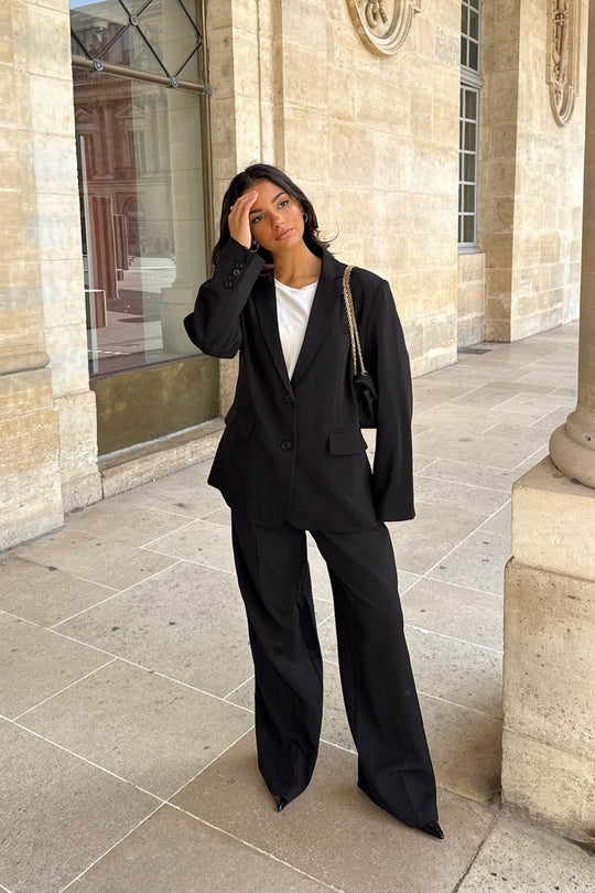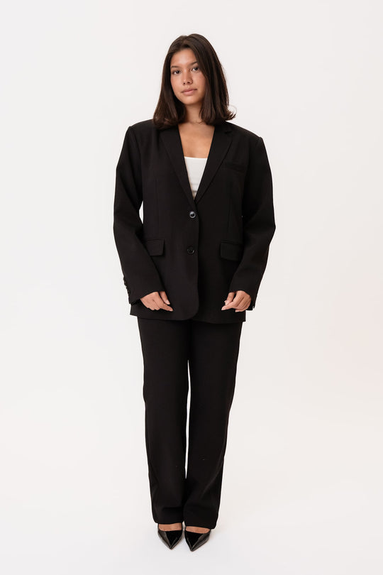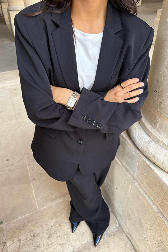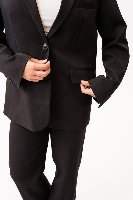 Svart blazer i et vakkert stoff. Den har en rett passform og rette ermer med knappedetaljer i mansjettene. Det er én lomme på venstre bryst, to lommer foran nederst og en skjortekrage som går ned i en V foran, hvor to knapper lukkes. En splitt bak gir et elegant preg til helhetsinntrykket.