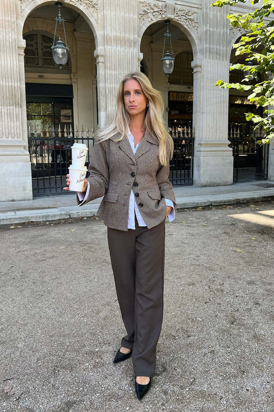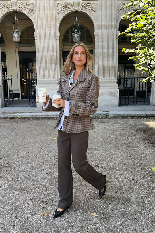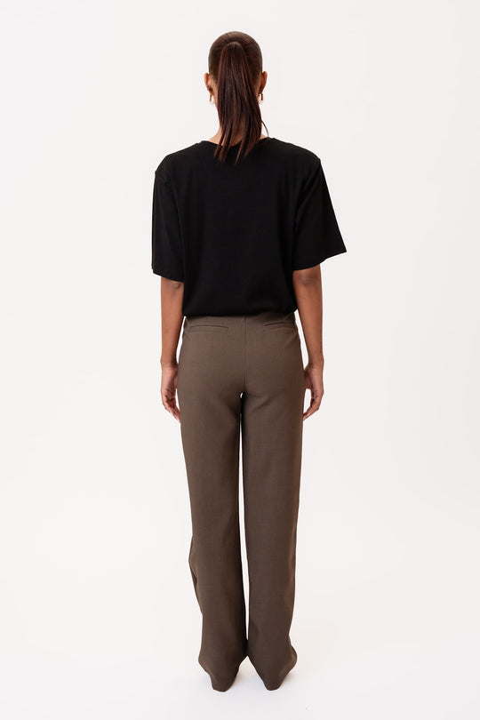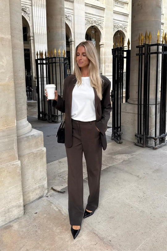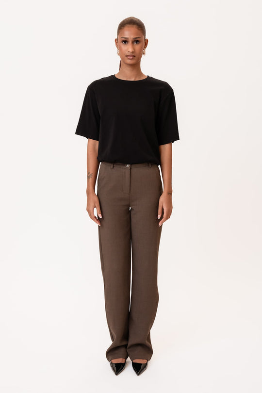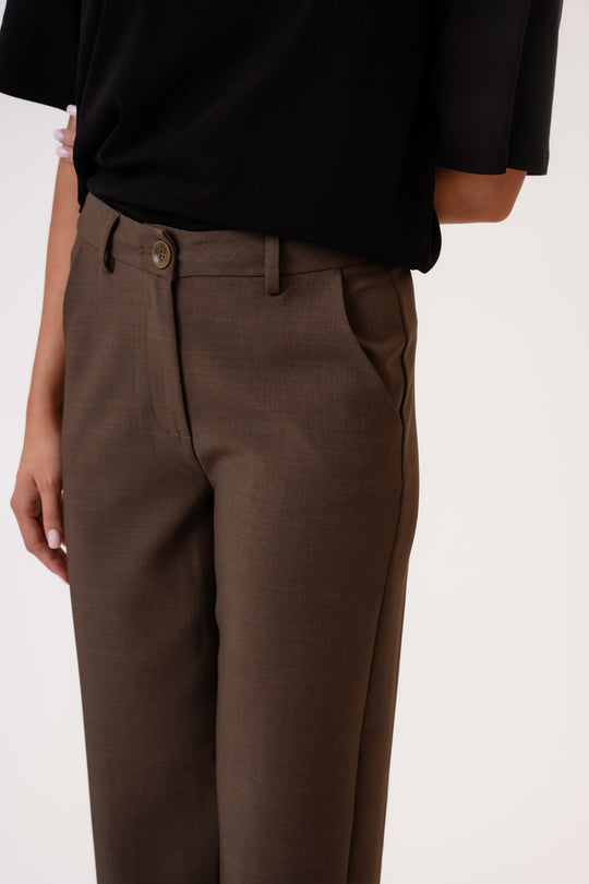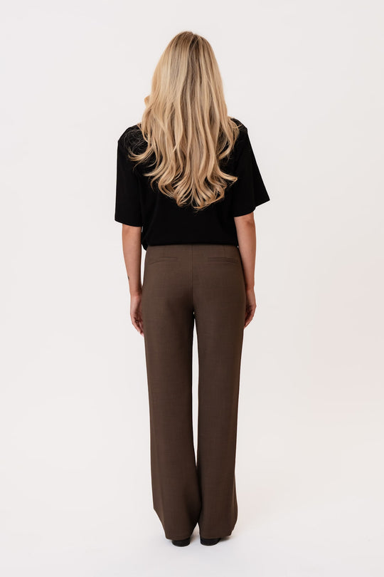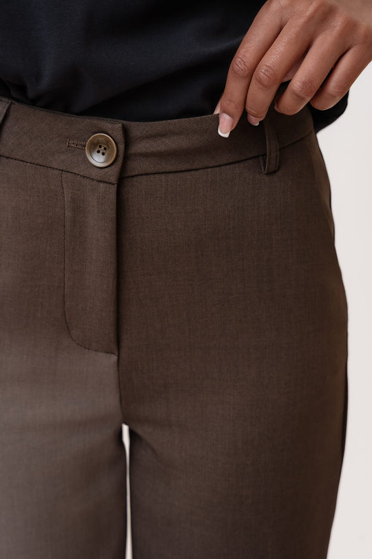 Vakre, enkle mørkebrune bukser med litt stretch og rett passform i beina. De har beltehemper i livet og knapp- og glidelåslukking foran. I tillegg har buksene to lommer foran og to fuskelommer bak. Buksene er tilgjengelige i forskjellige midjestørrelser og lengder.