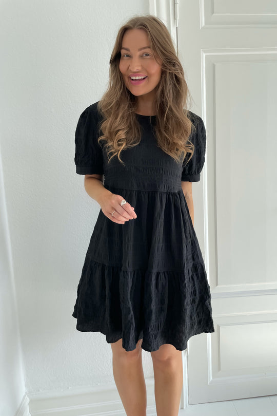 Beautiful and simple short light green dress with short sleves, round neck and a little button in the neck - Perfect to wear with a knit for the cold nights.