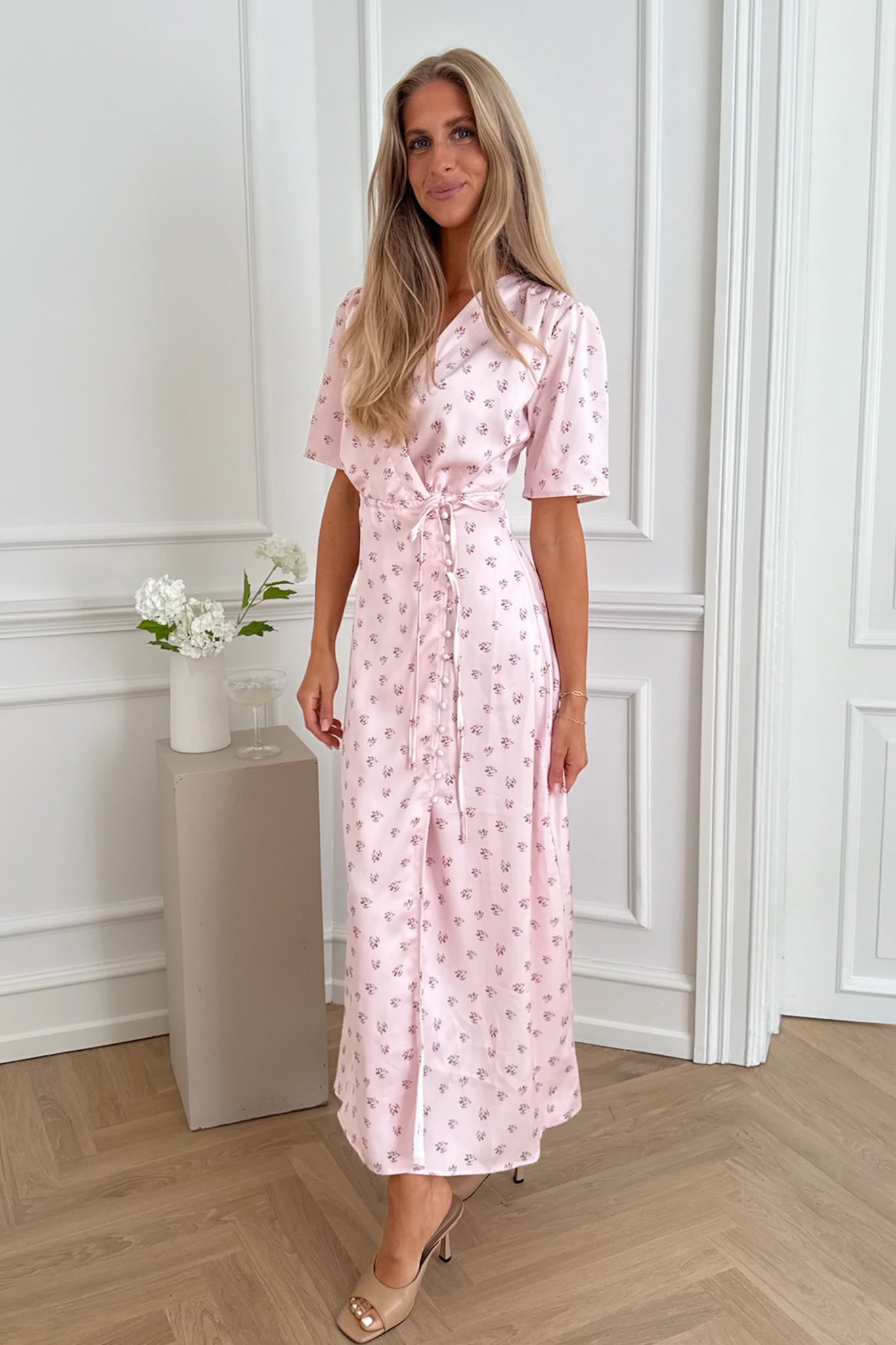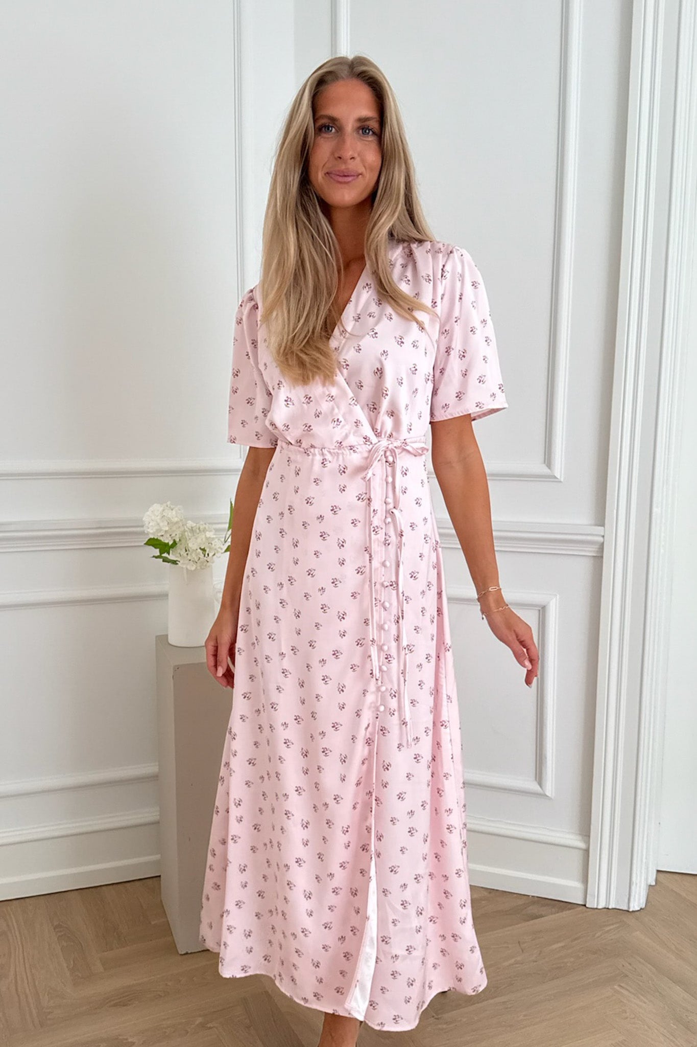 Vakker maxi-omslagskjole i sateng i rosa blomsterprint. Kjolen har en tilpasset midje, fremhevet med et knytebelte. Den har også knapper under beltet for lukking. Kjolen er detaljert med volanger over skuldrene, har korte løse ermer og V-hals.
