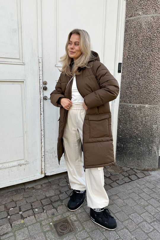Comfy and warm long winter jacket in brown with zipper closure and pockets.